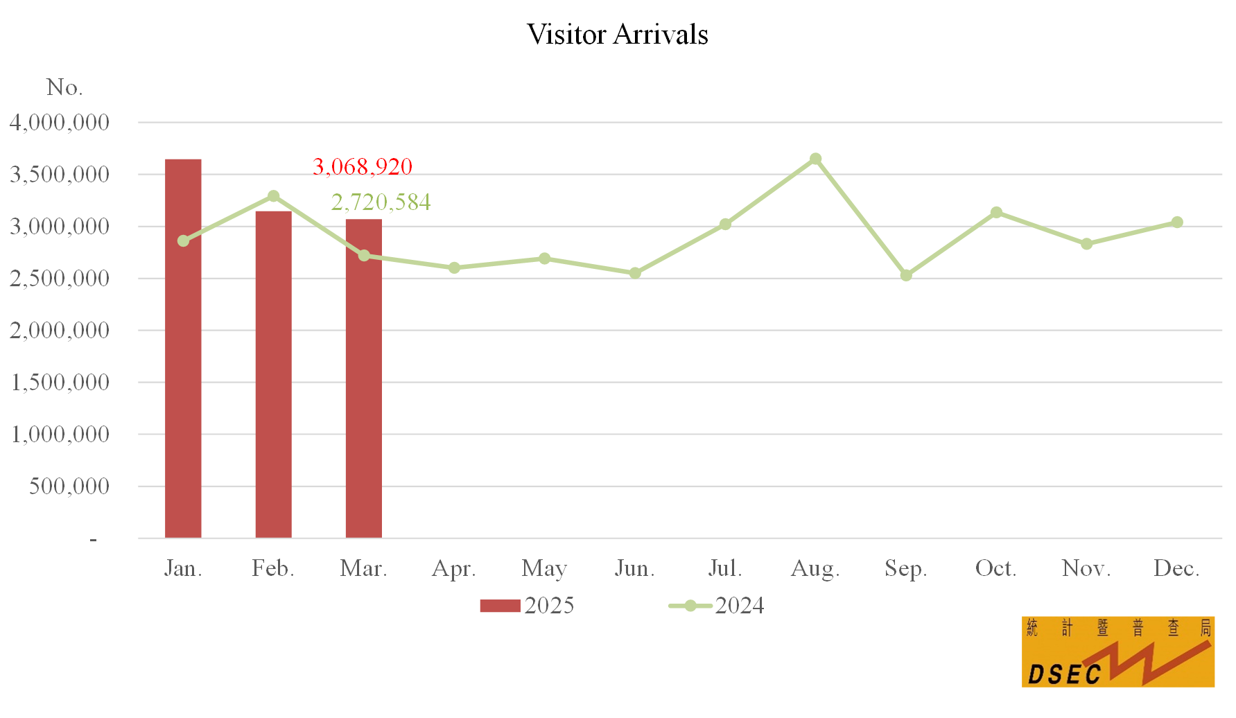In March 2025, number of visitor arrivals totalled 3,068,920, up by 12.8% year-on-year. Same-day visitors (1,780,279) and overnight visitors (1,288,641) increased by 23.3% and 0.9% respectively. The average length of stay of visitors shortened by 0.1 day year-on-year to 1.1 days; the duration of stay for same-day visitors (0.2 day) and overnight visitors (2.3 days) both remained unchanged.