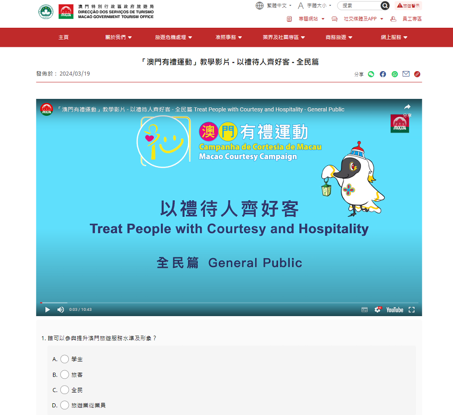 Os residentes e operadores turísticos são convidados a visionar o vídeo educativo online da Campanha de Cortesia de Macau - Toda a População, com a duração de cerca de 10 minutos, disponível em “Curso Online”, na página electrónica da DST (www.dst.gov.mo). O vídeo está disponível em cantonês, com legendas em chinês tradicional, português e inglês, com tradução de língua gestual e uma secção de perguntas e respostas, contando também com elementos interactivos para aprofundar a consciência do público sobre a cortesia e hospitalidade. A DST irá ainda divulgar o vídeo educativo em diferentes plataformas e canais de divulgação, bem como, através das instituições de ensino, operadores turísticos e associações educativas, aumentar a eficácia da promoção.