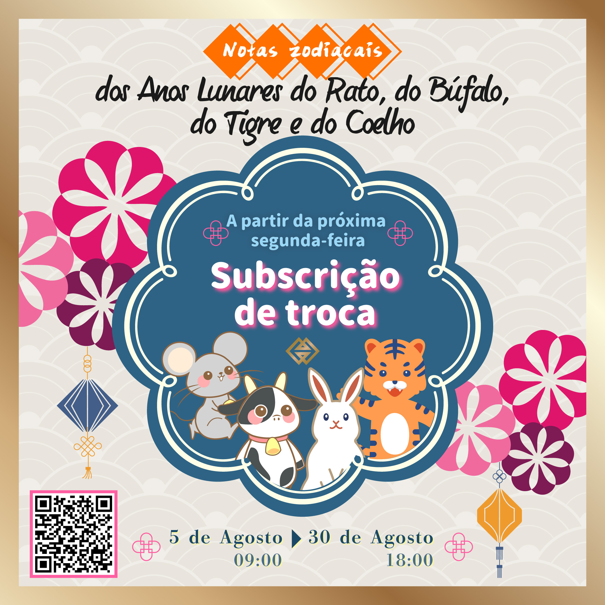 As notas zodiacais dos Anos Lunares do Rato, do Búfalo, do Tigre e do Coelho emitidas pelos dois bancos emissores serão colocadas novamente à subscrição dos residentes de Macau, sendo que o prazo de subscrição “online” decorre a partir das 9H00 da próxima segunda-feira (dia 5 de Agosto) e terminará às 18H00 do dia 30 de Agosto.