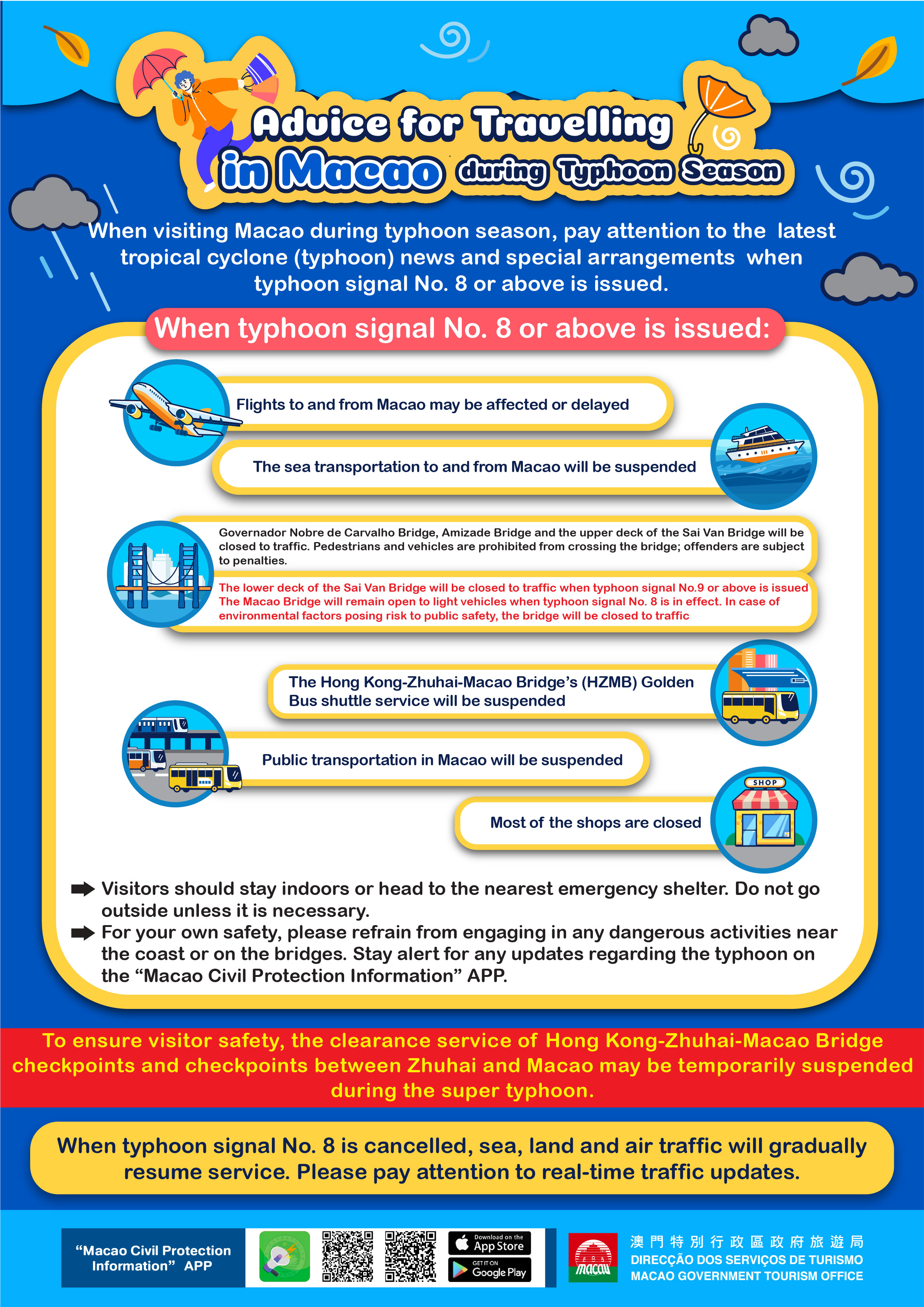 De acordo com informação da Direcção dos Serviços Meteorológicos e Geofísicos, o sinal de tempestade tropical n.º 8 está em vigor. A Direcção dos Serviços de Turismo (DST) já enviou mensagens de telemóvel a alertar os residentes de Macau que se encontram no exterior e os visitantes que estão em Macau sobre o içar do sinal de tufão n.º 8. Enquanto estiver em vigor o sinal n.º 8 ou superior estão suspensos todos os transportes públicos em Macau. A DST apela aos visitantes que permaneçam em local seguro, evitando sair, e sugere que estejam atentos à página electrónica da Direcção dos Serviços Meteorológicos e Geofísicos (www.smg.gov.mo/pt) e do Gabinete de Comunicação Social (www.gcs.gov.mo) ou que descarregarem a aplicação para telemóvel “Protecção Civil de Macau” para obterem as últimas informações. Nas páginas electrónicas e nas contas oficiais da DST nas redes sociais também são publicadas informações meteorológicas actualizadas e outros dados relacionados. A Linha Aberta para o Turismo (2833 3000) mantém-se em funcionamento 24 horas.