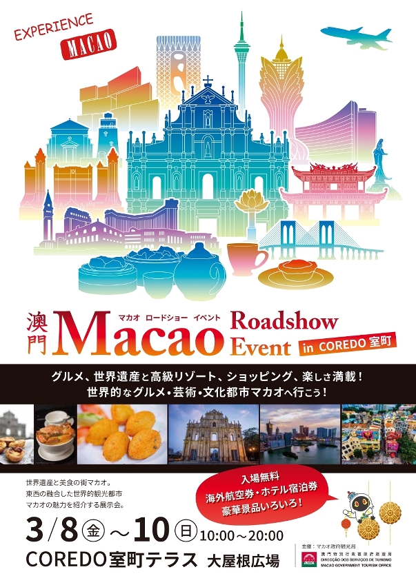 旅游局今年首个大型路展将于3月8至10日,一连三天在东京COREDO室町Terrace大屋根广场举行。本次路展是在去年全面通关以来,澳门在日本举行的第一个路展活动。澳门航空及澳门六家综合度假休闲企业亦在现场设置展位,推广旗下旅游设施及崭新元素,联动推出各类优惠旅游产品,共同扩展客源。