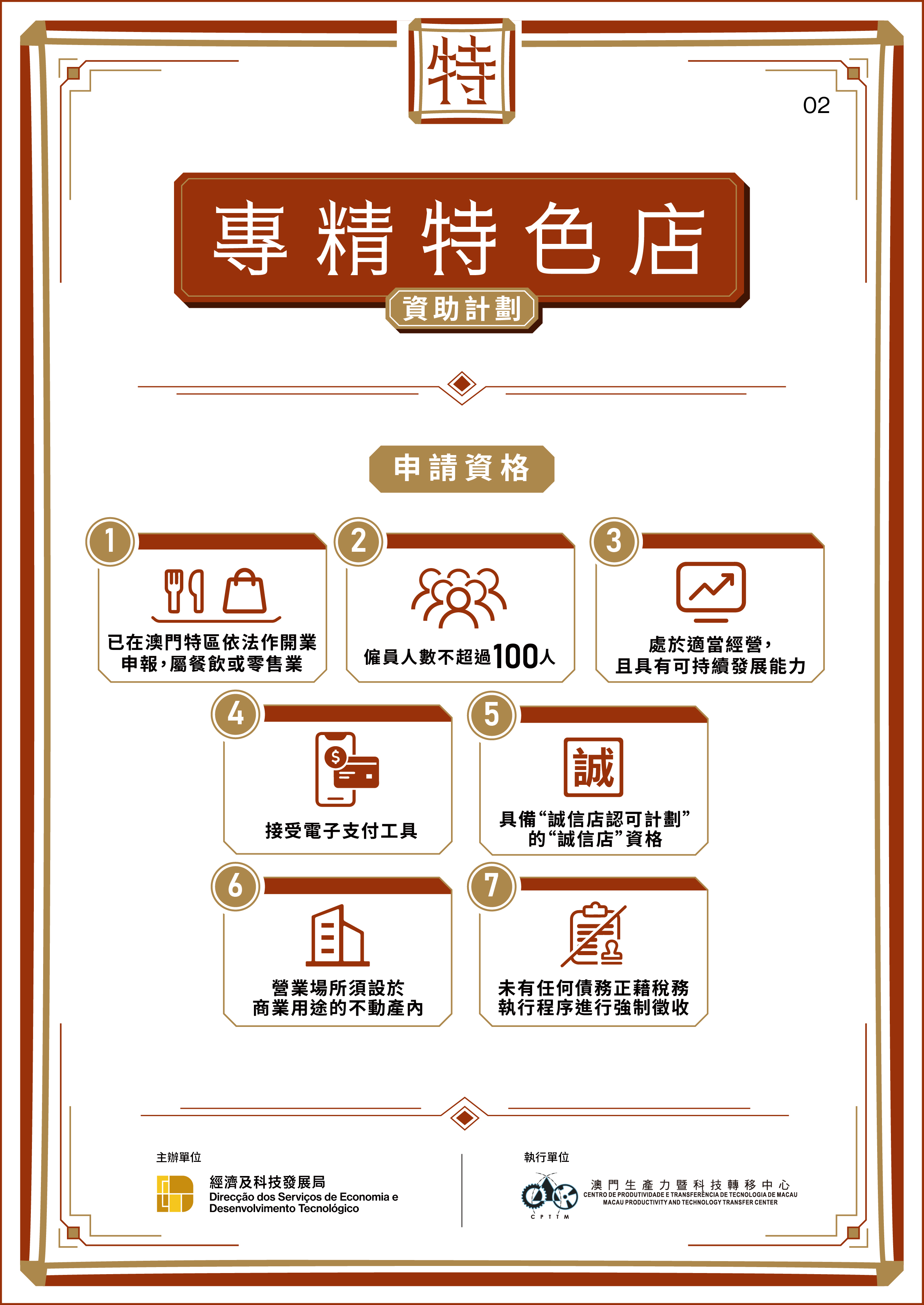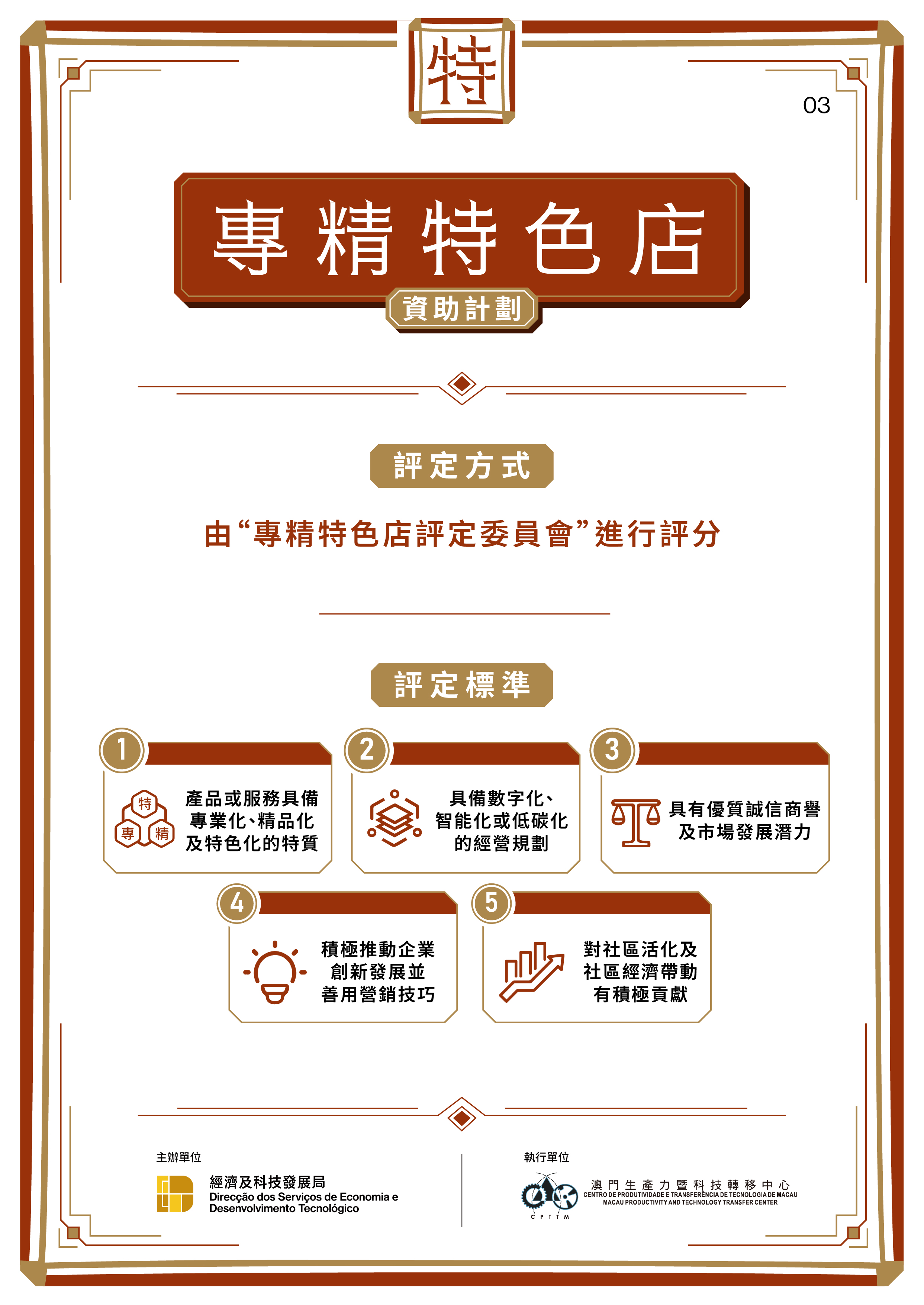 获评定为“专精特色店”的中小企业,可获资助实施线上营销、打造特色店面,以及推出IP联乘商品相关指定费用的六成资助,上限15万澳门元。此外,执行单位将为“专精特色店”提供一对一专业顾问指导,并对其商业计划书及经营方案进行诊断及改良。