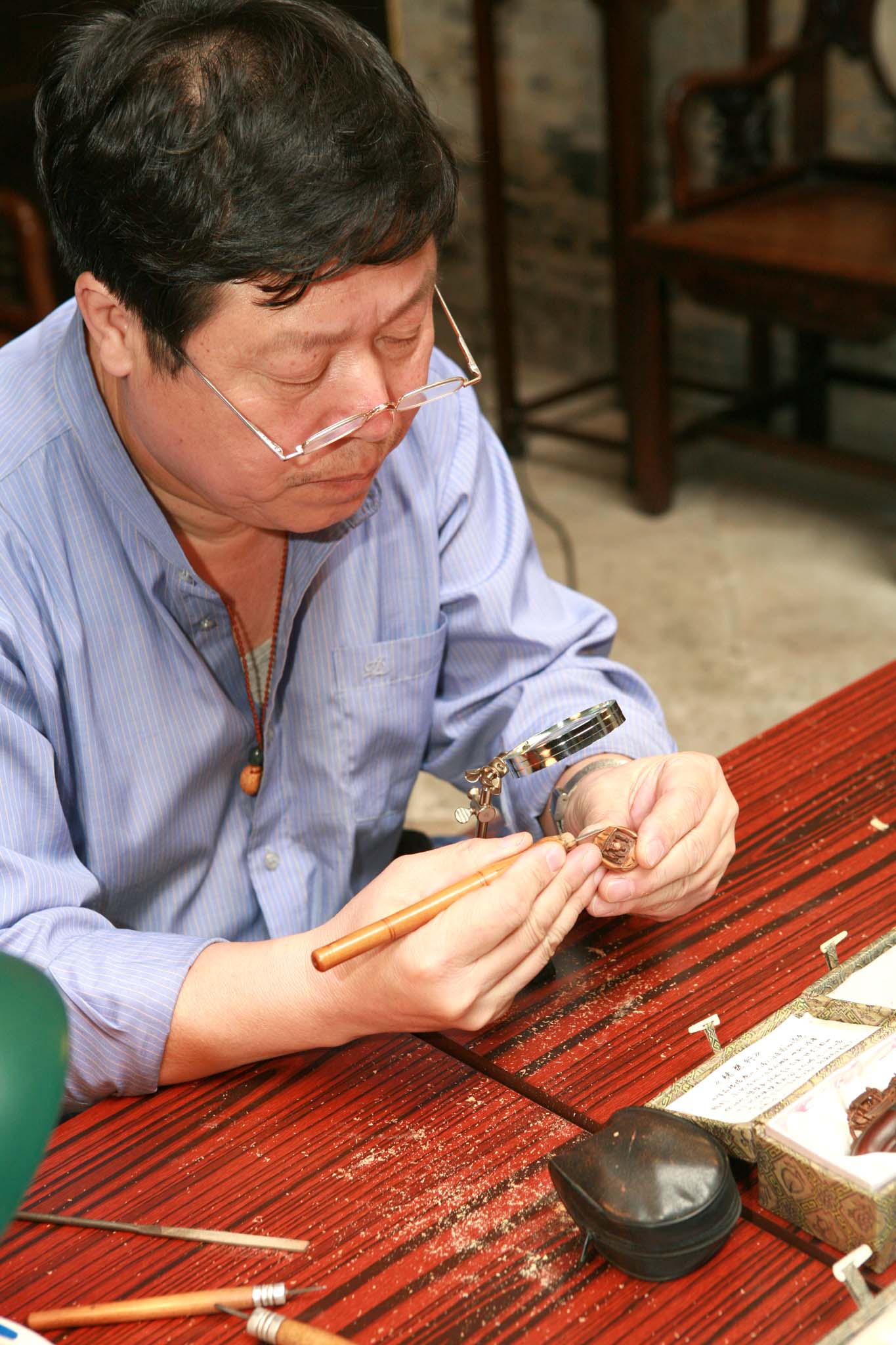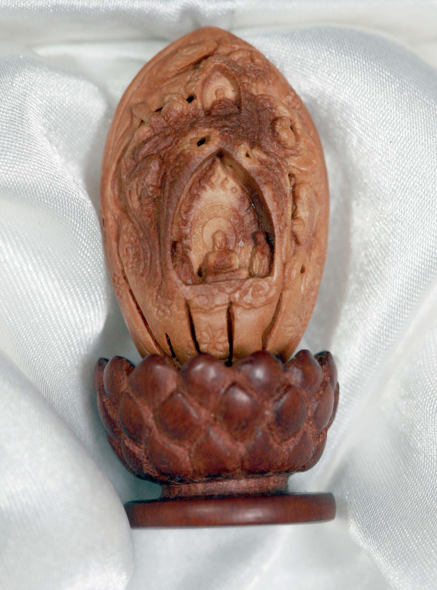核雕,是指在桃核、橄欖核等果核上,雕刻出各種人物、走獸、山水等圖像的一種民間微型雕刻工藝。核雕雖微,卻微中見宏。工藝家劉秉恒在只有不到拇指般大的桃核上,雕出題材各異的核雕精品,立體生動,工藝不凡。核雕作品上的門窗可靈活開關,更能窺見內部人像,令人讚嘆。是次展出作品中的《西廂記》,把“驚豔”、“聽琴”、“佳期”、“送別”等動人情節細緻地表現出來。另一釋迦牟尼佛像,高度不足兩亳米,卻依然眉眼淸晰,表情肅穆祥瑞,堪稱是世上最小的立體釋迦牟尼佛。
