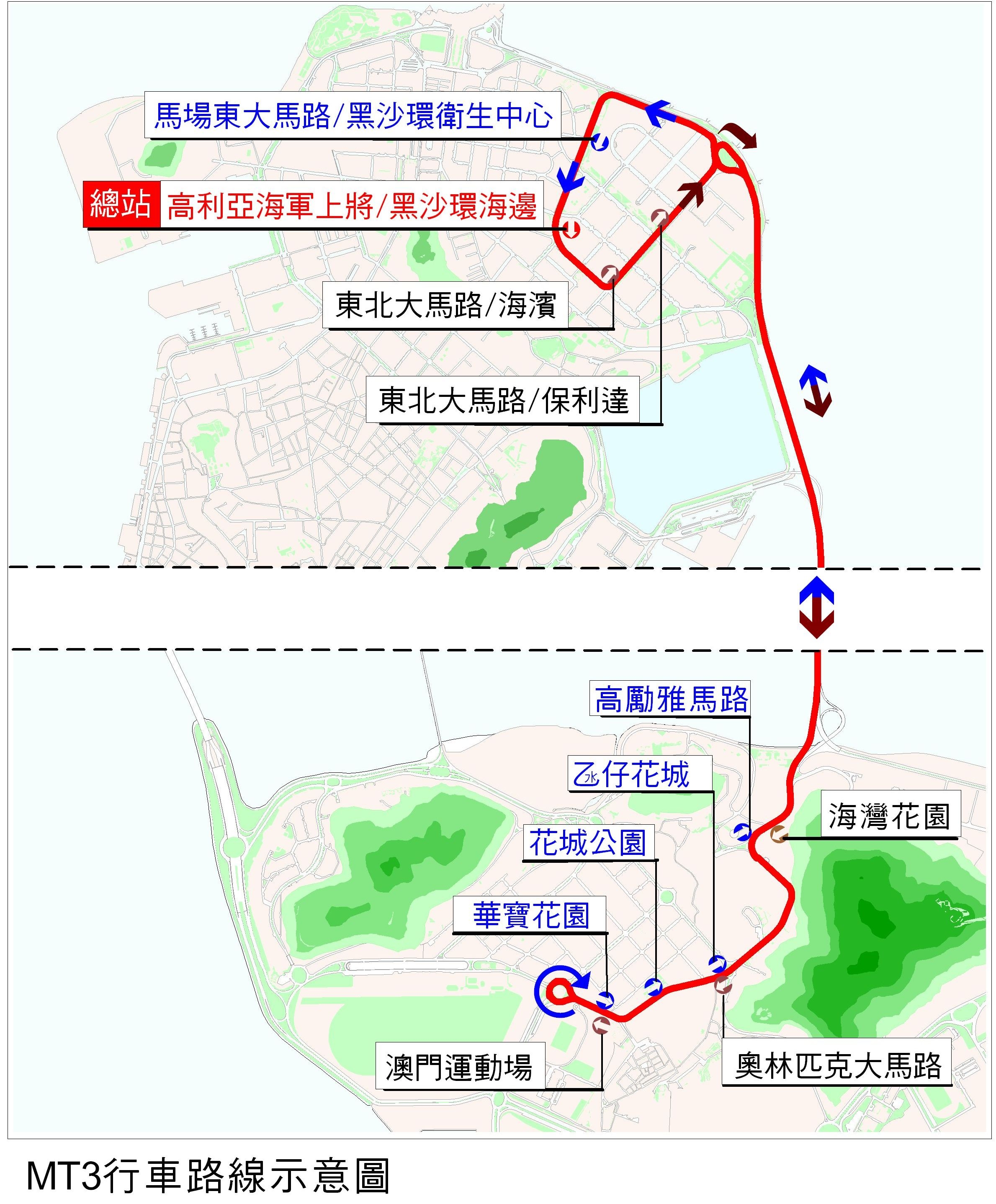 為紓緩北區與氹仔主幹馬路的巴士服務,土地工務運輸局由本年三月一日開始推出MT3快線,經過近三個月的運行,有關快線能有效疏導繁忙時間來往澳氹的部份人流。為進一步優化MT3的運作,土地工務運輸局除延長試辦期三月外,同時將延長該路線的服務時間以及調整部份站點。由六月一日起將取消勞動節大馬路總站,新總站設於高利亞海軍上將大馬路近新建華商業中心的位置,同時於馬場東大馬路近黑沙環衛生中心增設上落客點,以方便由氹仔往黑沙環衛生中心的市民,其他站點及路線維持不變。
