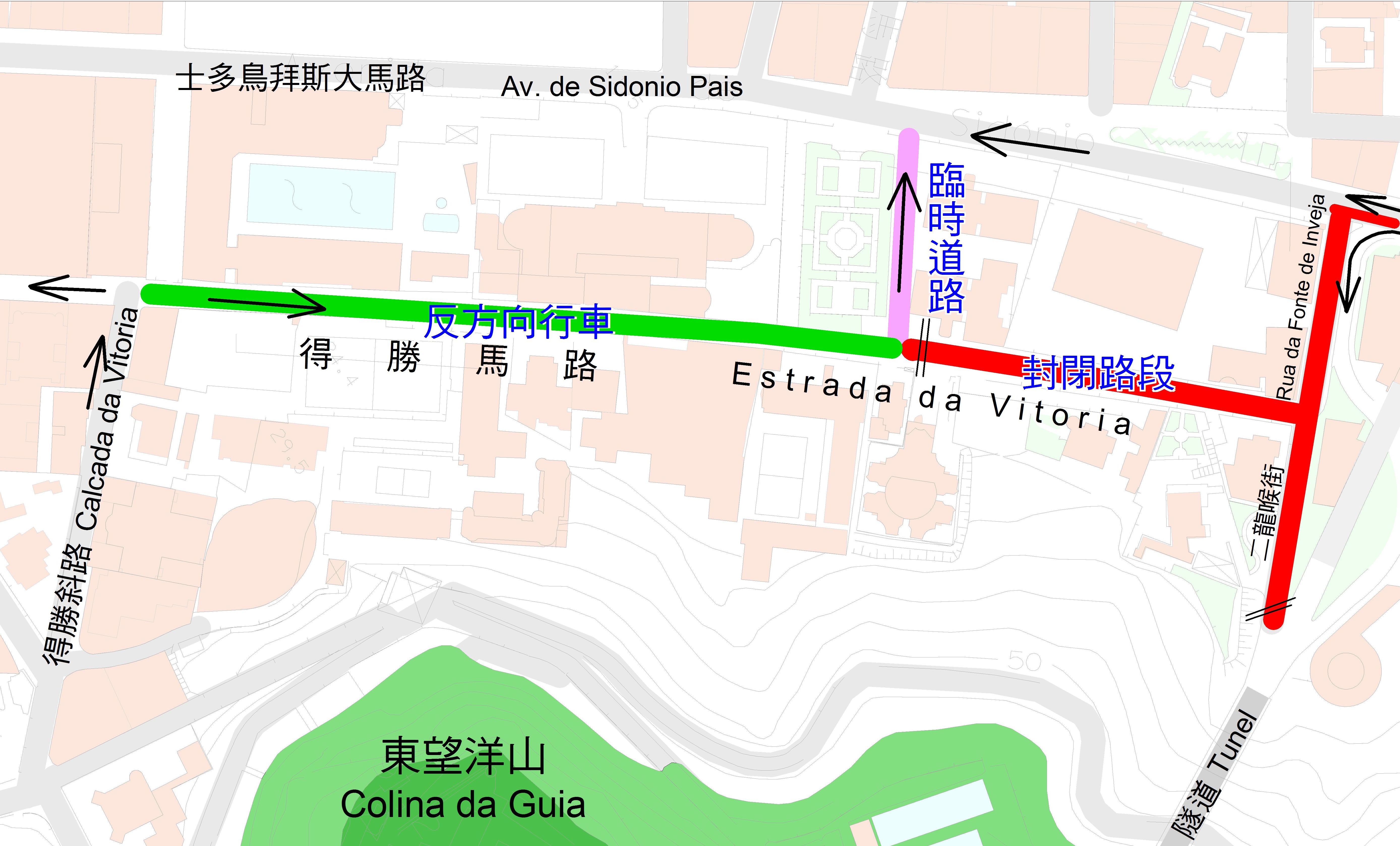 於下周一實施的臨時交通改動措施如下:由於介乎二龍喉街與華力花園大廈之間的一段得勝馬路,以及二龍喉街側近得勝馬路的車行道將禁止行車及泊車,因此,來自松山隧道的車輛只能取道行車天橋往高士德大馬路;而來自士多鳥拜斯大馬路的車輛則只能經由側近魯彌士幼稚園的車行道,往松山隧道出羅理基博士大馬路。工程進行期間,來自羅理基博士大馬路的車輛若要往士多鳥拜斯大馬路,可取道水塘馬路。至於另一臨時改動是:介乎得勝斜路與得勝花園之間的一段得勝馬路實施反方向行車,由該路段往士多鳥拜斯大馬路,可取道設於栢景停車場側邊的臨時道路前往。敬請駕駛者留意有關改動措施,並遵守路上所設置的臨時交通標誌。