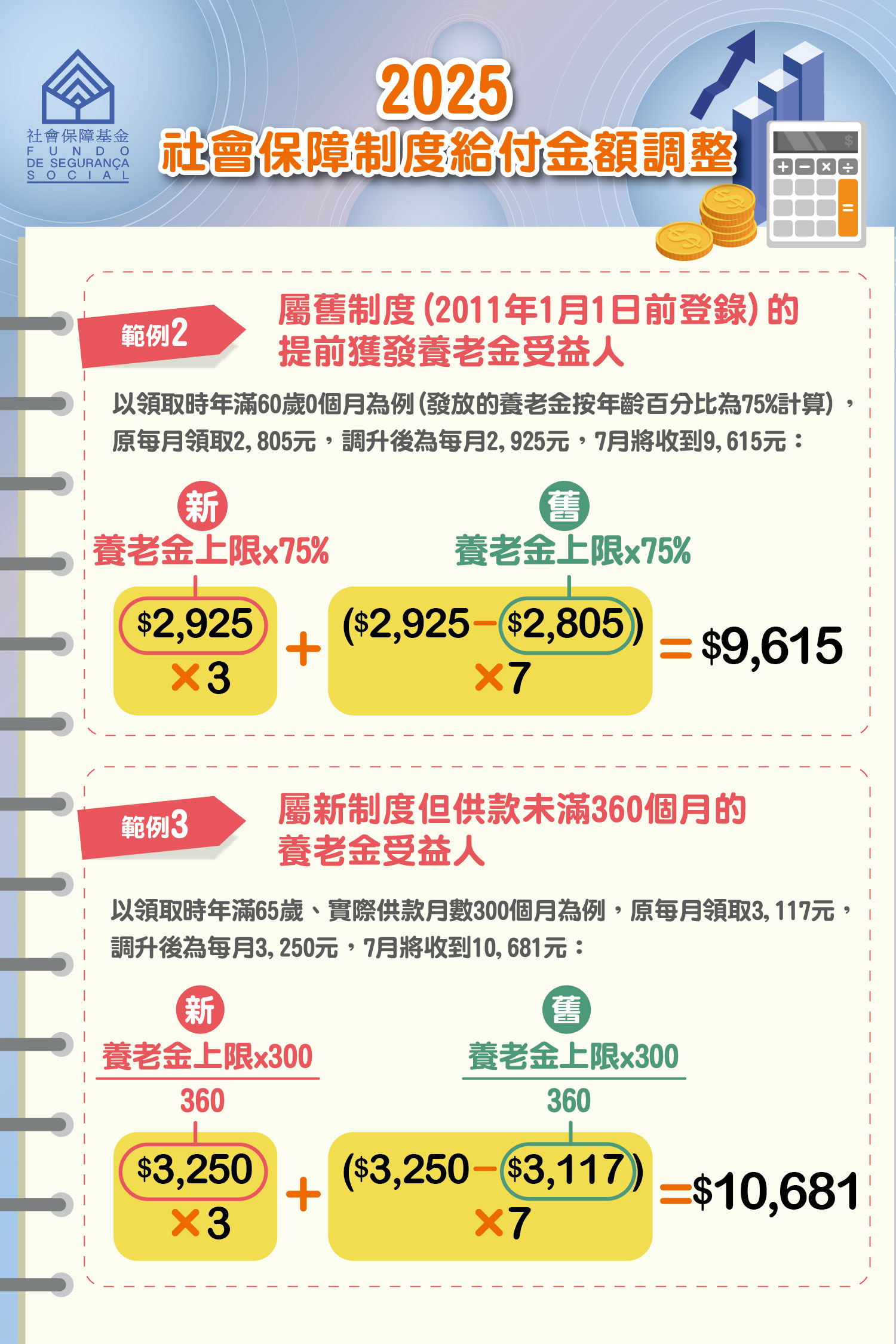 調升後,養老金上限及殘疾金由原來3,740元/月(澳門元,下同)調升至3,900元/月、失業津貼調升至157元/日、疾病津貼中住院津貼調升至157元/日,非住院津貼調升至119元/日、出生津貼調升至6,500元、結婚津貼調升至2,220元、喪葬津貼調升至2,870元,效力追溯至今年1月1日。