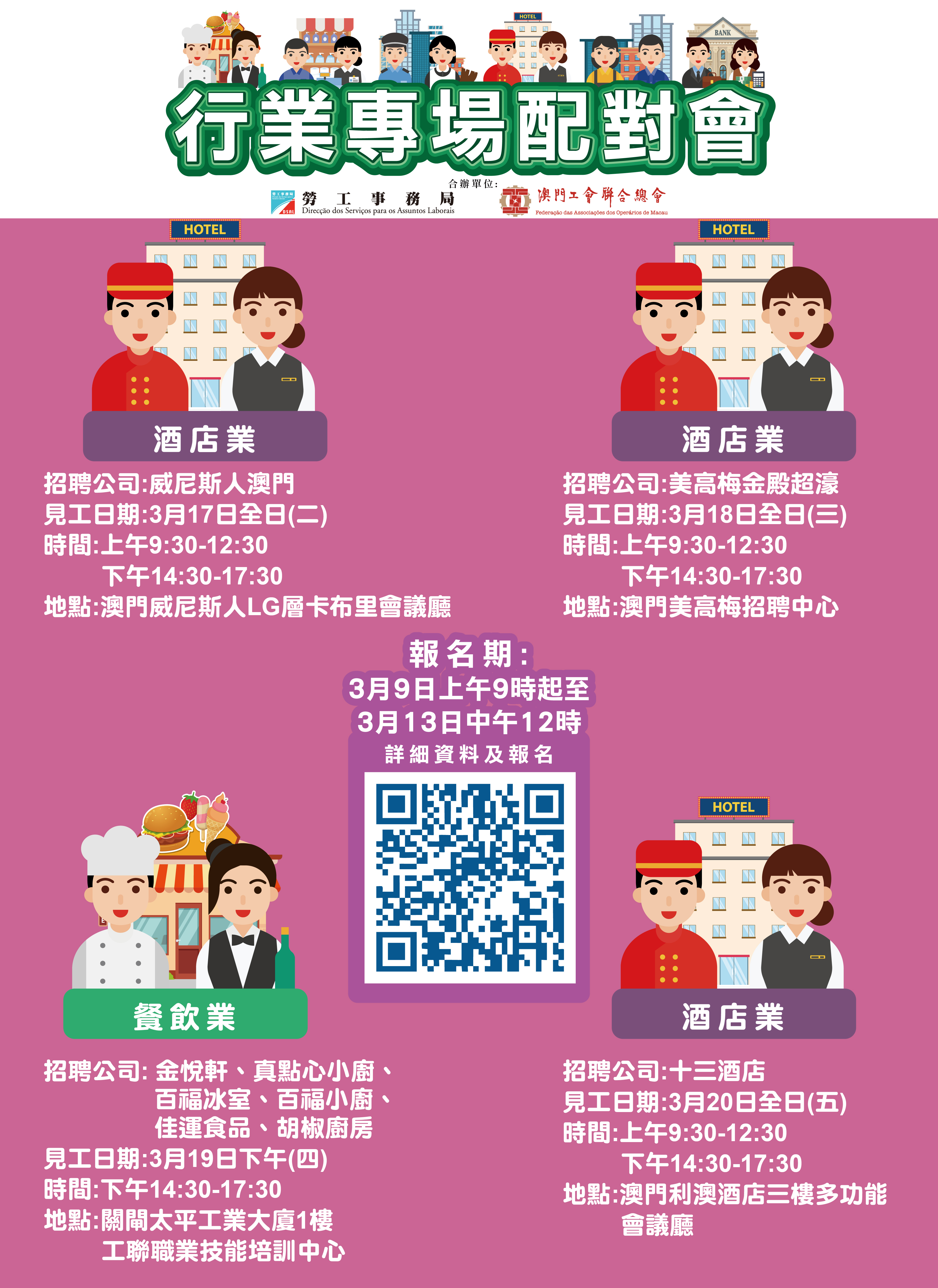 • 3月19日假澳門關閘馬路101-105A號太平工業大廈第一期1樓工聯職業技能培訓中心舉辦餐飲業專場配對會,參與企業為“金悅軒海鮮火鍋酒家”、“真點心小廚”、“百福冰室”、“百福小廚”、“佳運食品有限公司”及“胡椒廚房”,合共提供288個職位空缺,主要職位包括主任、部長、咨客、廚師、廚師助理、餐飲服務員及倉務物流員等崗位。