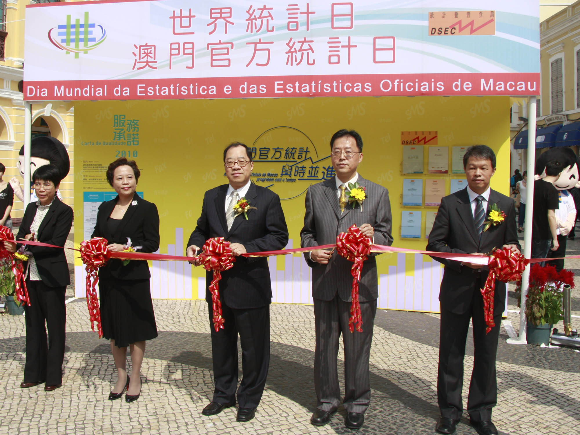 The Statistics and Census Service (DSEC) organized a two-day exhibition (3 November) at the Leal Senado Square, to mark the celebration of the World Statistics Day and the Official Statistics Day of Macao. The opening ceremony was officiated by the Secretary for Economy and Finance, Mr. Francis Tam; President of the Monetary Authority of Macao, Mr. Anselmo Teng; Director of DSEC, Ms. Vanessa Kong; and Deputy Directors of DSEC, Mr. Paul Ieong and Ms. Ana Cheng.