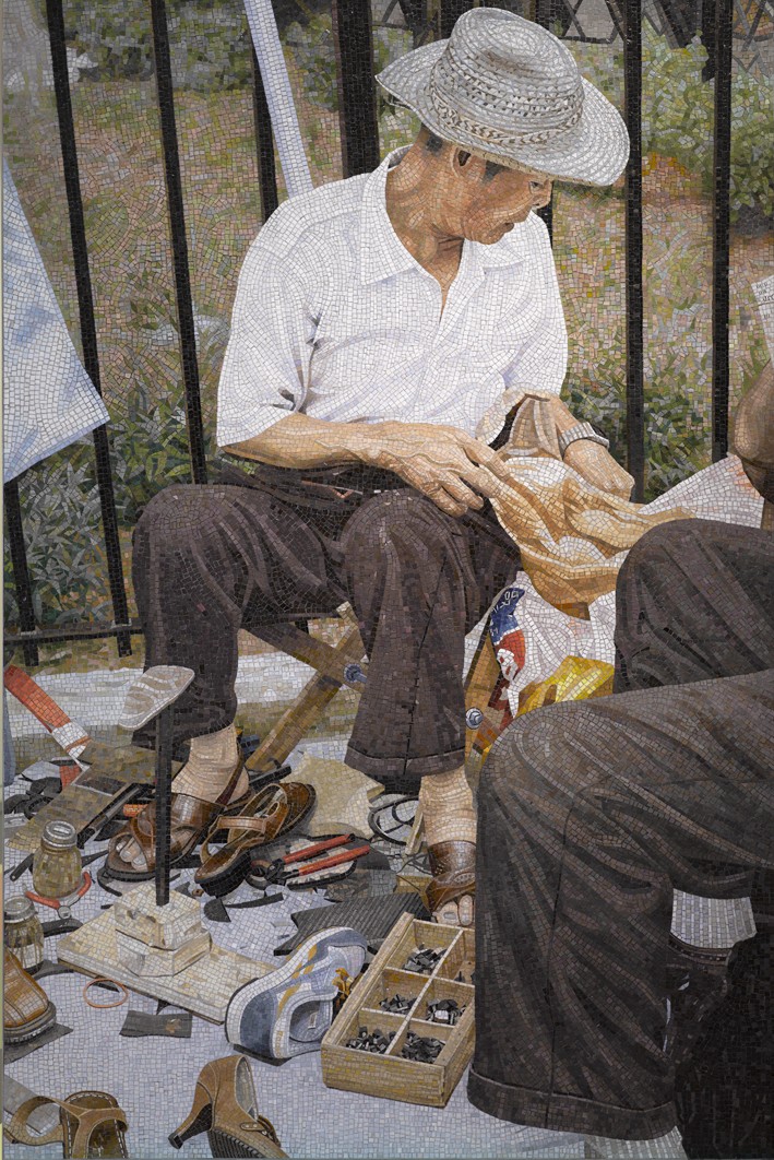 In the series of mosaics, Frandsen explores themes from everyday life. His careful observations, and the exploration of distinct lines create a unique perspective, which is central to his artistic expression. With his series of stainless steel works painted without brushes, colour or canvas, Frandsen offers a highly original take on contemporary painting.