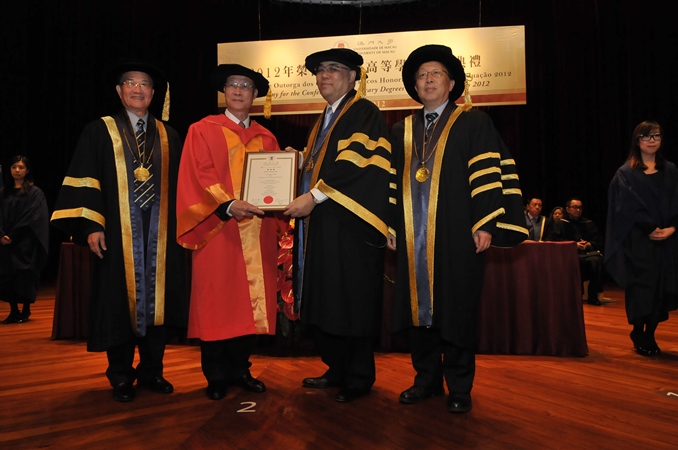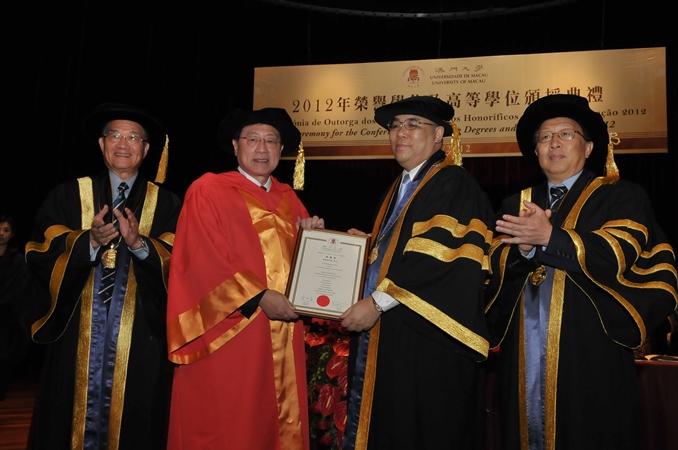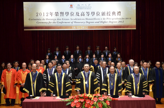 The University of Macau’s (UM) Ceremony for Conferment of Honorary Degrees and Higher Degrees 2012 was held today (16 November). Dr. Chui Sai On, chief executive of Macao SAR and chancellor of UM, presided over the ceremony and met with three honorary degree recipients. In his speech, Dr. Chui said that UM has made progress in soft and hard strengths, with rapid advancement in scientific research, and with the new development mode, UM should shoulder greater responsibility and become the backbone of Macao’s cultural innovation and science and technology development. He said that the SAR government will continue to provide policy- and resource-wise support to UM in its future development.