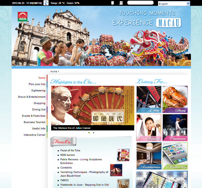 The website presents travel information in 9 categories namely Plan your trip, Sightseeing, Shows & Entertainment, Shopping, Dining Out, Events & Festivities, Business Tourism, Useful Info and Interactive Corner. Besides general sightseeing info, the website comes with different new items and provides more elaborate categorization as well as comprehensive travel tips for visitors. New subcategories such as Shows, Cultural & Creative Industries Zones, Family Fun, etc. are added into the category of Shows & Entertainment; in addition, the Shopping category inspires ideas of shopping in Macau by zone and category, whereas Macanese Cuisine and Recipes are introduced in the Dining Out category. Visitors can experience Macau in wide-ranging perspectives through the website.