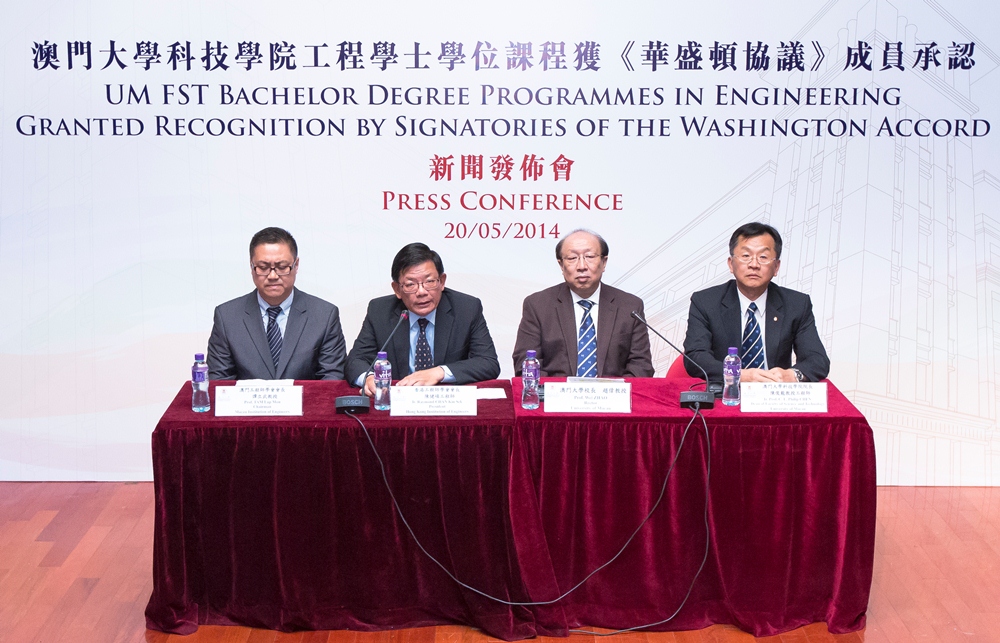 Three bachelor’s degree programmes offered by the University of Macau (UM) Faculty of Science and Technology (FST), namely Bachelor of Science in Civil Engineering, Bachelor of Science in Electrical and Computer Engineering, and Bachelor of Science in Electromechanical Engineering, have been recognised by the signatories to the Washington Accord. Students starting these three programmes in the 2011/2012 academic year or later are eligible to obtain professional qualifications in numerous signatories to the Washington Accord. This is the first programmes in Macao to be recognised under the Washington Accord. It is also the first out-of-jurisdiction accreditation meeting the Washington Accord standards. The three programmes were accredited by the Hong Kong Institution of Engineers (HKIE) in 2012.