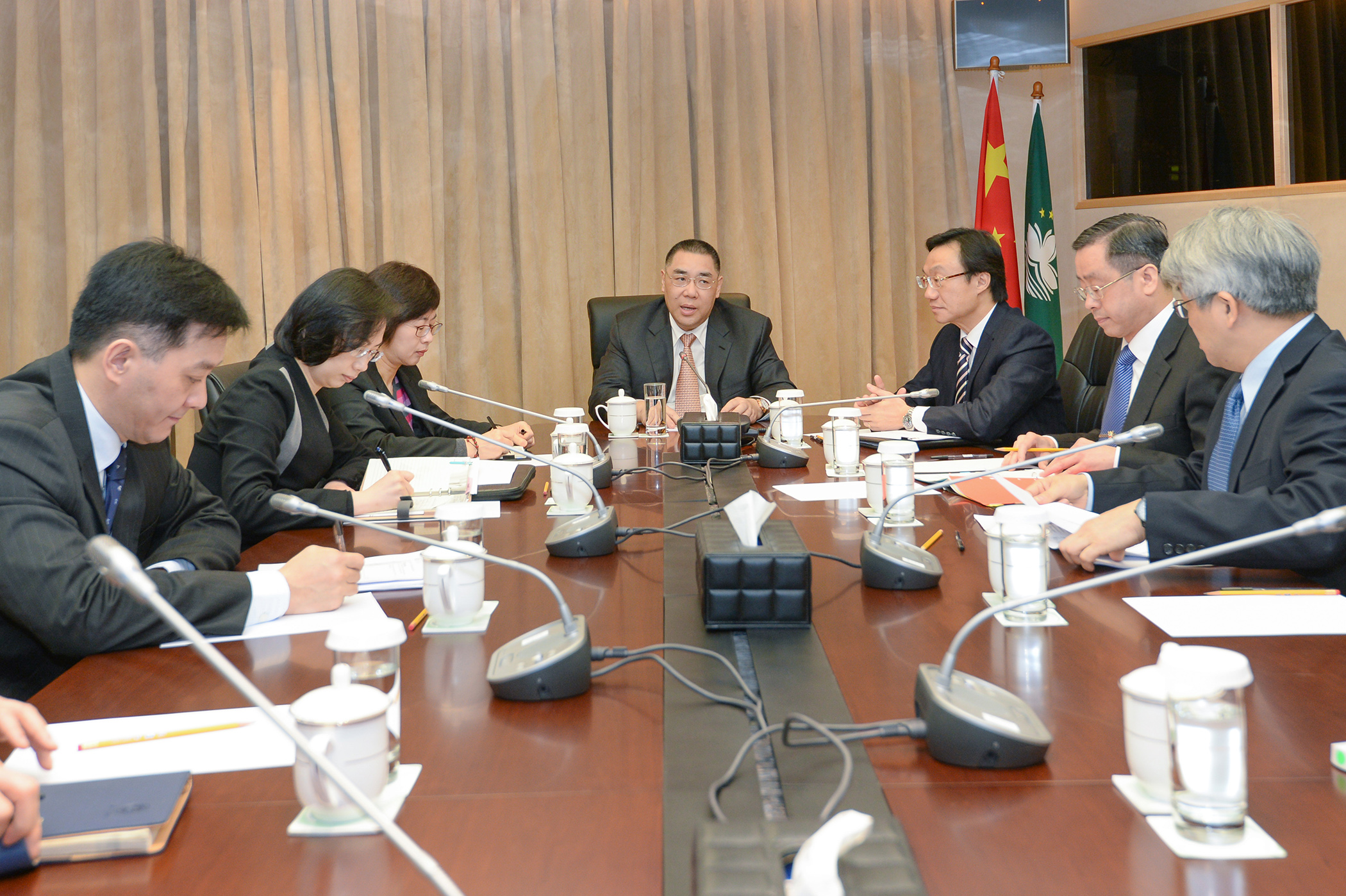 Officials who also attended the meeting were the Secretary for Administration and Justice Ms Chan Hoi Fan, the Secretary for Social Affairs and Culture Mr Tam Chon Weng, the Chief-of-Office of the Chief Executive’s Office Ms O Lam, the Commissioner of the Fire Services Bureau Mr Ma Io Weng, the President of the Civic and Municipal Affairs Bureau Mr Vong Iao Lek, the Director of the Health Bureau Mr Lei Chin Ion and the consultant of the Chief Executive’s Office Mr Wu Kan.