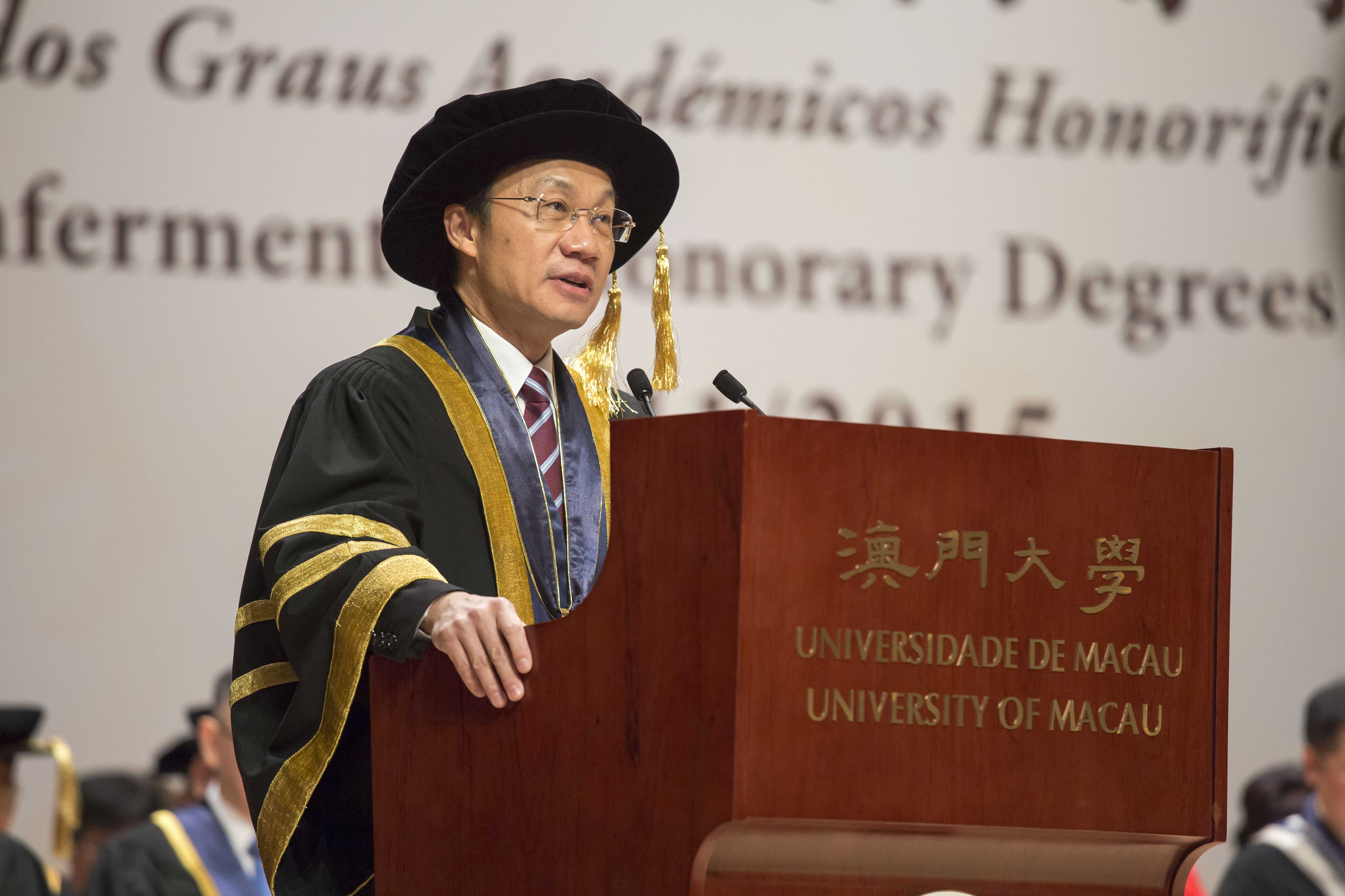 Tam Chon Weng, secretary for social affairs and culture of the Macao SAR and representative of the chancellor of UM, expressed his hope that the graduates will cherish their memories of the time at UM, take good care of their families, be useful members of society, give back to society, and find purpose and meaning in their lives.
