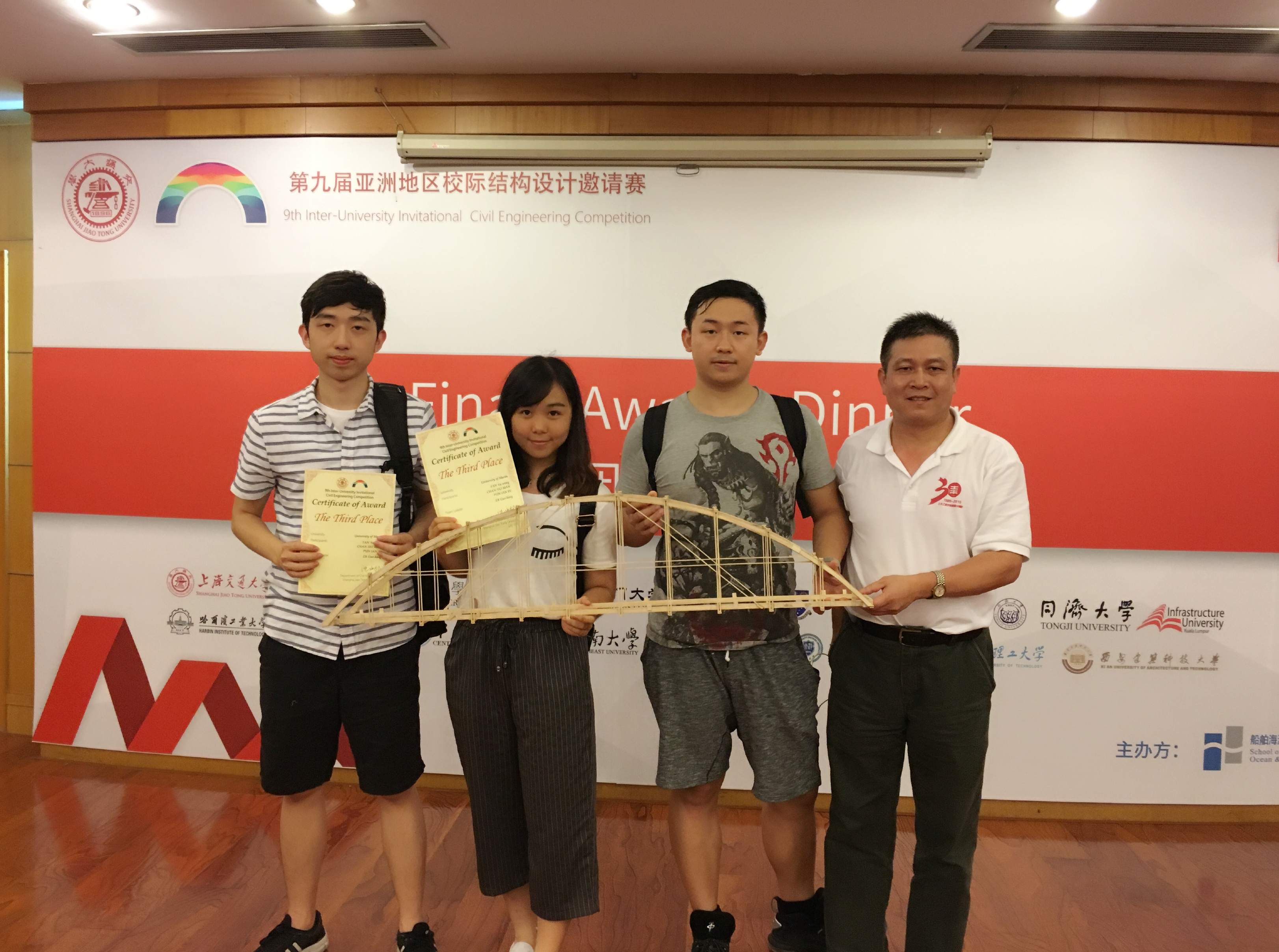 Three undergraduate students from the University of Macau’s (UM) Department of Civil and Environmental Engineering, namely Fan Yawang, Chan Sio Man, and Pun Ian In, placed third among all the teams and received the second prize at the Ninth Inter-University Invitational Civil Engineering Competition, which was held at Shanghai Jiaotong University, from 10 July to 15 July.