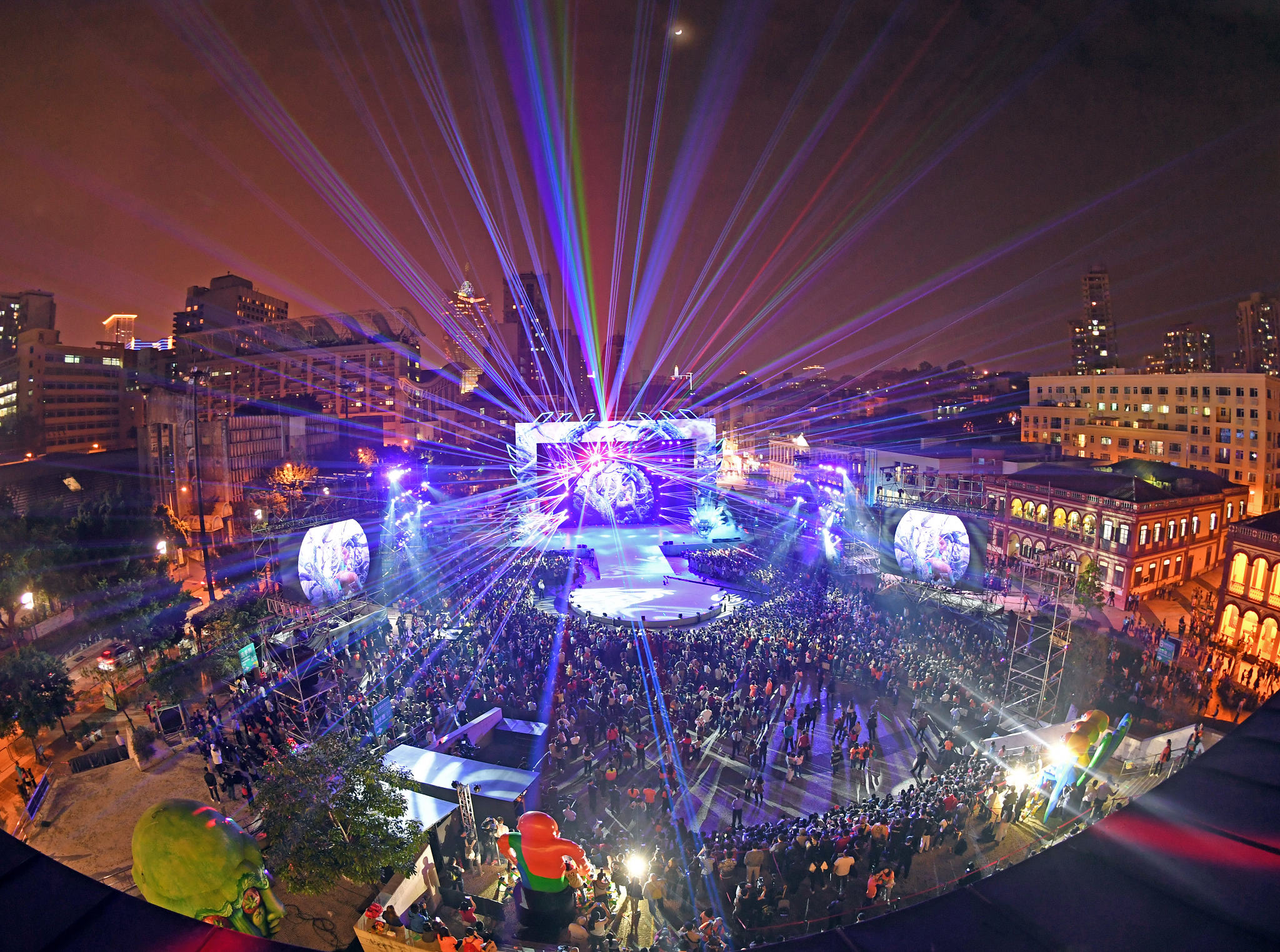 The performing groups set off on a journey that went through Rua de S. Paulo, St. Anthony’s Square, Rua de D. Belchior Carneiro, Rua dos Artilheiros, Rua de Sanches de Miranda, Calçada da Igreja de S. Lázaro, Santa Casa da Misericórdia Albergue, Rua de São Roque, Rua Nova de São Lázaro, St. Lazarus Square, Rua do Volong, Rua do Tap Siac and Rua de Afonso de Albuquerque, arriving at its final destination at 5:30pm at Tap Siac Square to celebrate the handover in a festive and carnival atmosphere. Additionally, this year the Parade offered an alternative route: some performing groups departed from Senado Square and marched through Largo de S. Domingos, Rua de S. Domingos, Rua da Palha and Rua de S. Paulo, finally joining the remainder of the parade at the Ruins of St. Paul’s. In the “Handover Celebration”, all performing groups presented a performance. The closing ceremony was then followed, bringing all the audience into a fantastic world. Soldiers waving the magic weapons performed an energetic street dance and protected the little VIVA in the hatching eggs. Acrobatic gymnastics with high degree of difficulty was performed, symbolizing the vitality of this remarkable city. The stage was suddenly transformed into a volcano and a desert, the mountain god, the flame creatures played together. VIVA invited all gods together to dance with the flame balls, spending a wonderful journey with the deities and beasts from Shan Hai Jing. A dazzling light show was then presented and the audience was enthusiastically responded. Giant balloons appeared and built up a dream scene to the sky over Tap Siac Square.