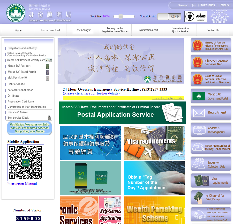 To be in line with the governance principle of the Special Administrative Region Government, the Identification Services Bureau (hereinafter referred to as DSI) keeps on studying and developing electronic services and simplifying administrative procedures. Starting from 5 December 2016, DSI introduces online application status enquiry and payment service for the aim of improving the formalities of the postal application for the Certificate of Criminal Record and Macao Special Administrative Region travel documents. Applicants from abroad can log in the “Postal Application Service” system in the website of DSI (webportal.dsi.gov.mo/postal) to check the status of their postal application and pay the application fee and postage with credit card.