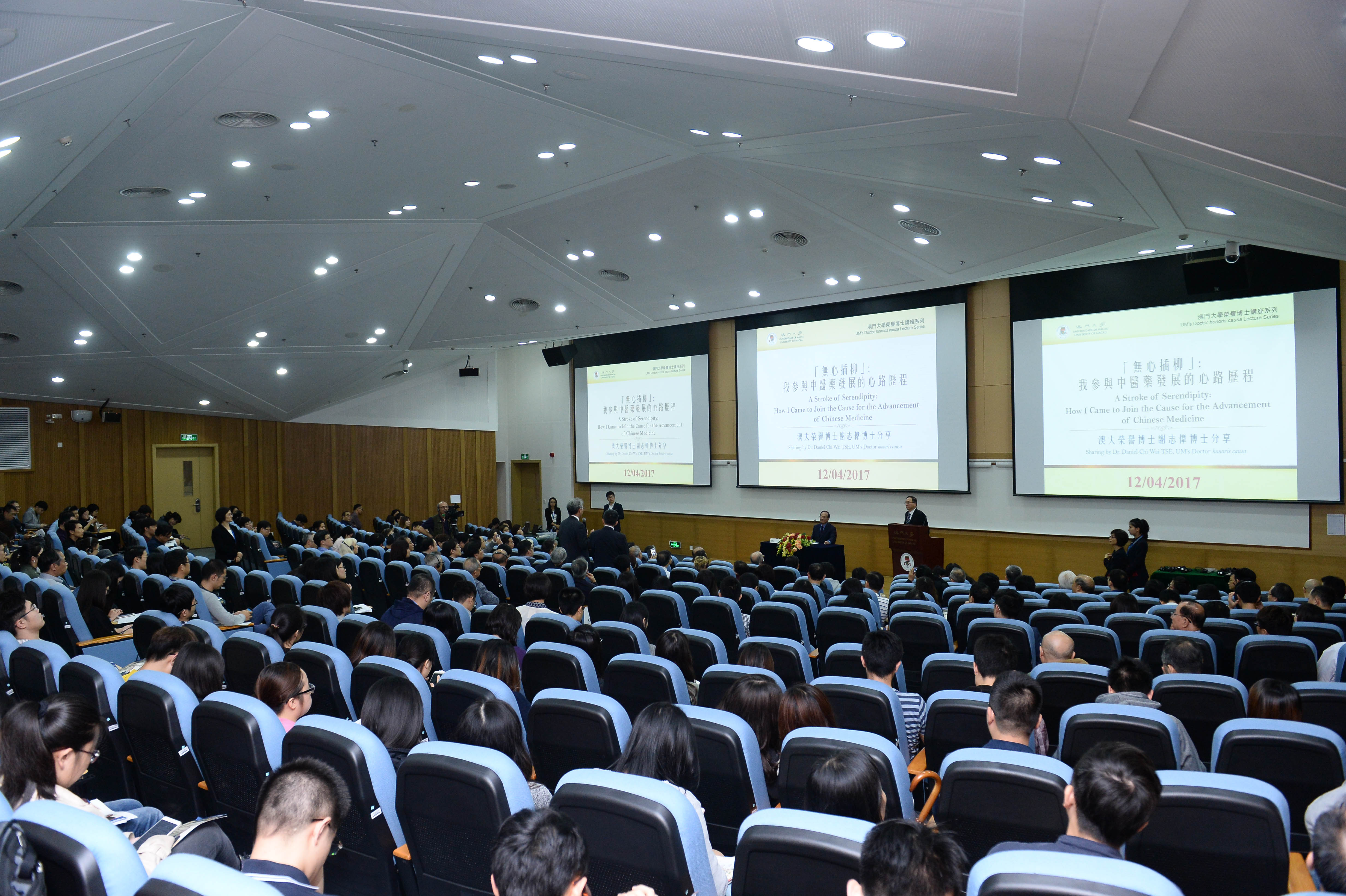 The University of Macau (UM) today (12 April) held a Doctor honoris causaLecture titled ‘A Stroke of Serendipity: How I Came to Join the Cause for the Advancement of Chinese Medicine’. Tse Chi Wai, UM’s honorary doctor and a renowned educator, was the keynote speaker. The lecture attracted a full-house audience.