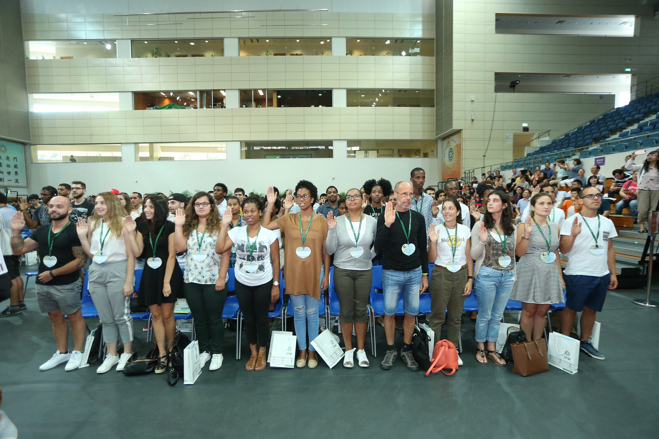 Macao Polytechnic Institute has successfully held the opening ceremony for the new academic year 2017-2018 in the afternoon of August 18 at the MPI Sports Pavilion. This year has witnessed a total number of 900 new students getting enrolled in various MPI programs, more than 80% are local students, and about 10% from the mainland and overseas. During the ceremony, more than 500 outstanding students were awarded scholarships sponsored by governmental agencies, organizations, enterprises, and individuals. The institute adheres to its management philosophy of "Small but beautiful and exquisite" and also emphasizes its long-term commitments to cultivate talents for the Macao community. Witnessed by all the guests, and both solemn and touching, all the freshmen swore an oath - "MPI's heart, our new start" - in joining the MPI family.