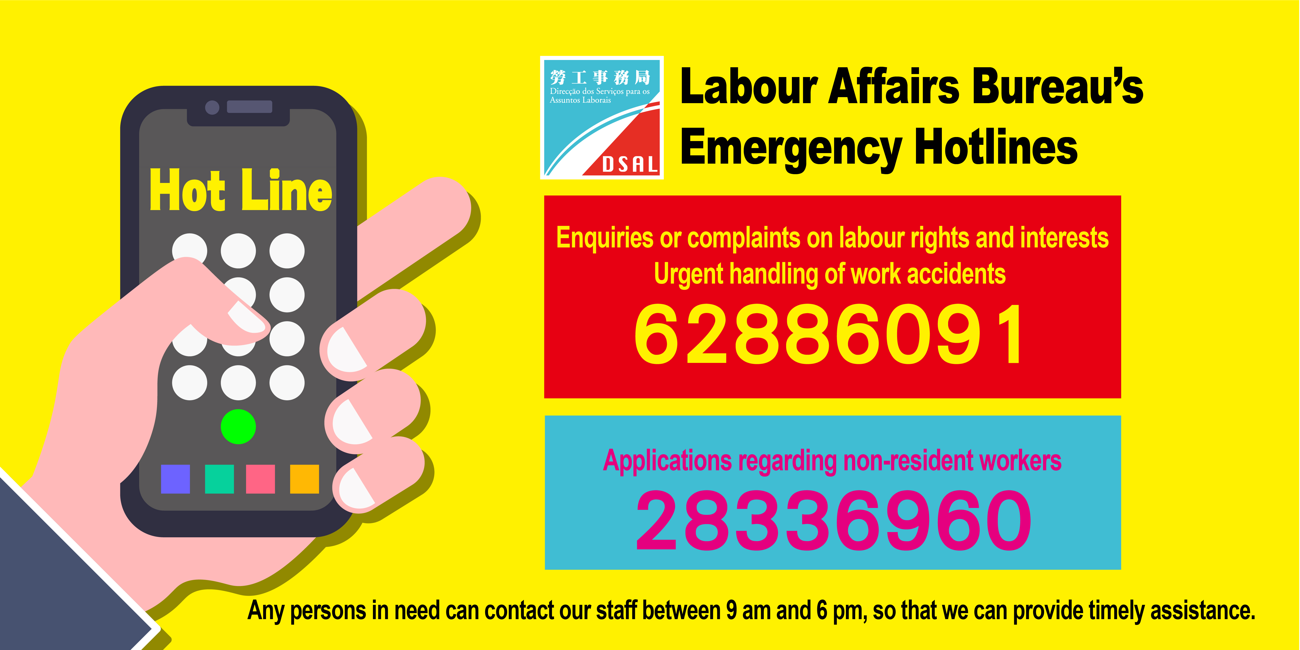 To be in line with the SAR government’s preventive measures against the epidemic, all of the public service points of the Bureau continue to be temporarily closed until the 16th of this month. However, the Bureau has arranged our staff to be on duty during this period. If members of the public have any enquires on labour rights and interests, or any urgent complaints, they can call the emergency hotline 62886091 between 9 am and 6 pm to contact our staff, so that we are able to provide assistance in a timely manner.