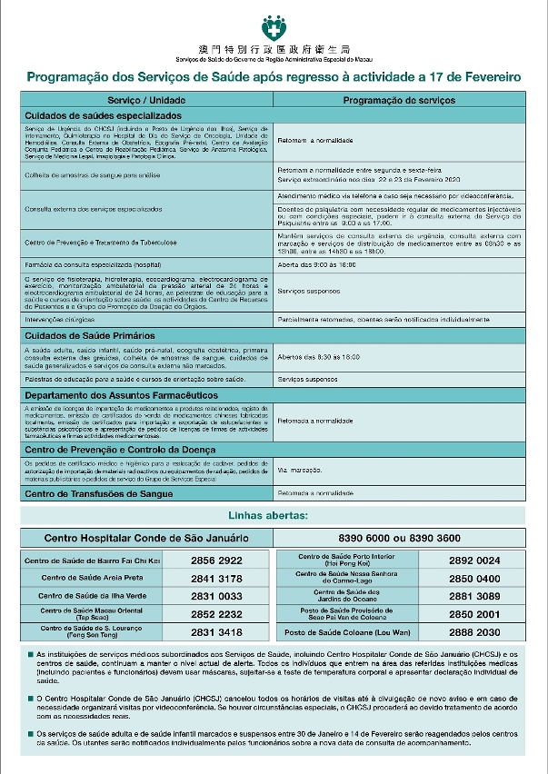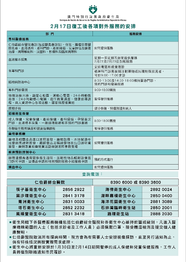 For enquiries, please call the Conde de S. Januario General Hospital hotlines at 8390 6000 or 8390 3600; contact phone numbers of Health Centres as follows: Fai Chi Kei Health Centre 2856 2922, Hac Sa Wan Health Centre 2841 3178, Ilha Verde Health Centre 2831 0033, ,Tap Seac Health Centre 2852 2232, Fong Son Tong Health Centre 283 13418, Hoi Pong Health Centre 2892 0024, Nossa Senhora do Carmo - Lago Health Centre 2850 0400, Ocean Gardens Health Centre 2881 3089, Seac Pai Van (Coloane) Temporary Health Station 2850 2001, Coloane Health Station 2888 2030.