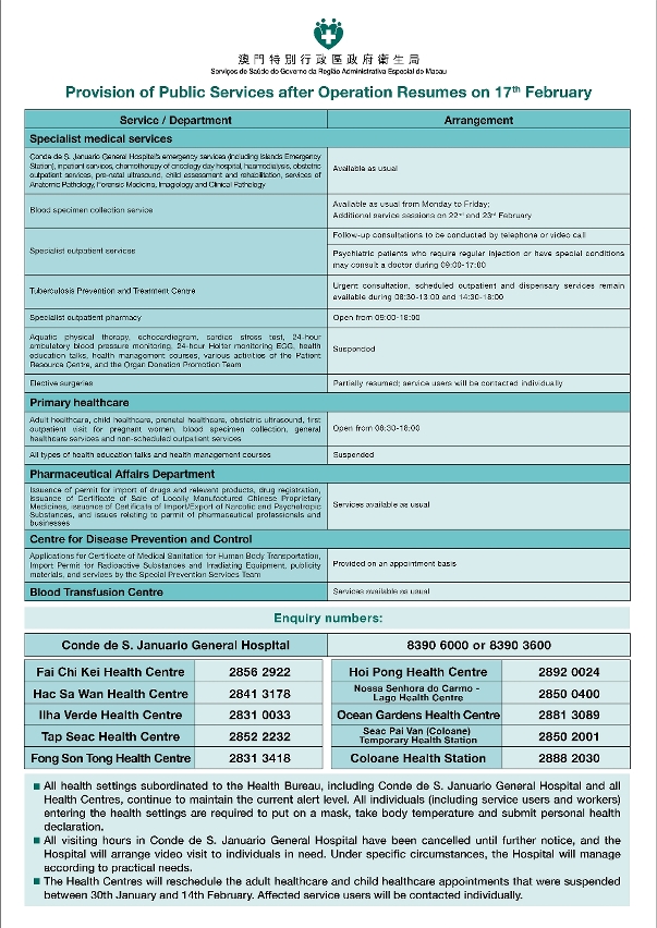 The Health Bureau announces that, with a view to ensuring public safety and reducing the flow of people, the arrangements for public health services from 17th February (Monday), when operation resumes, are as follows: