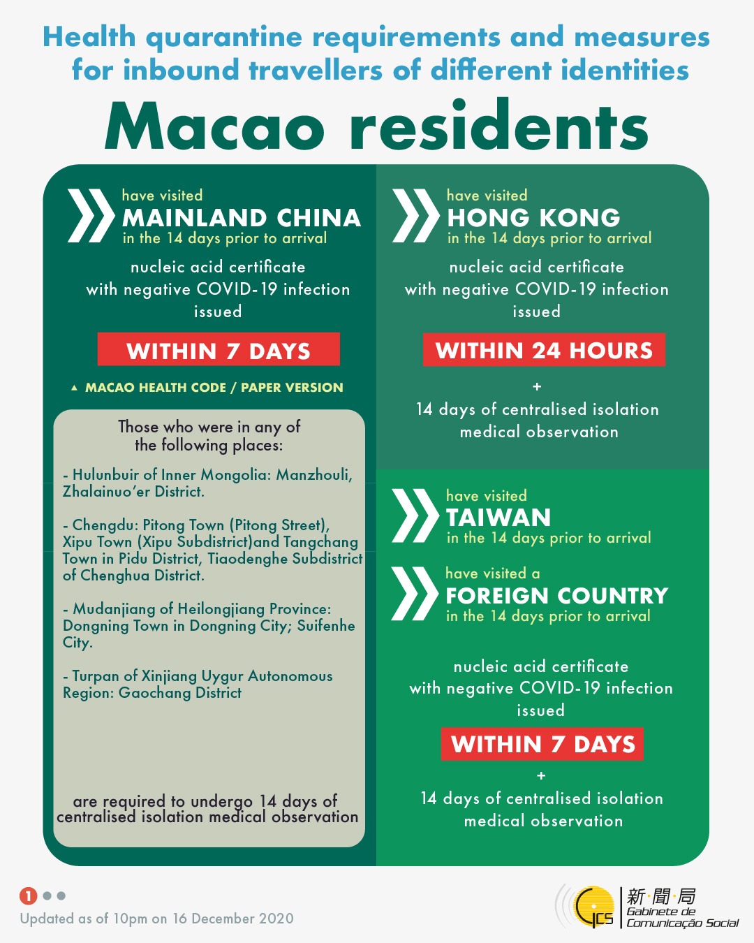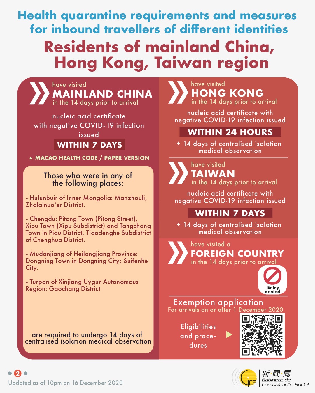 Health quarantine requirements and measures for inbound travellers of different identities, updated on 16 December 2020.