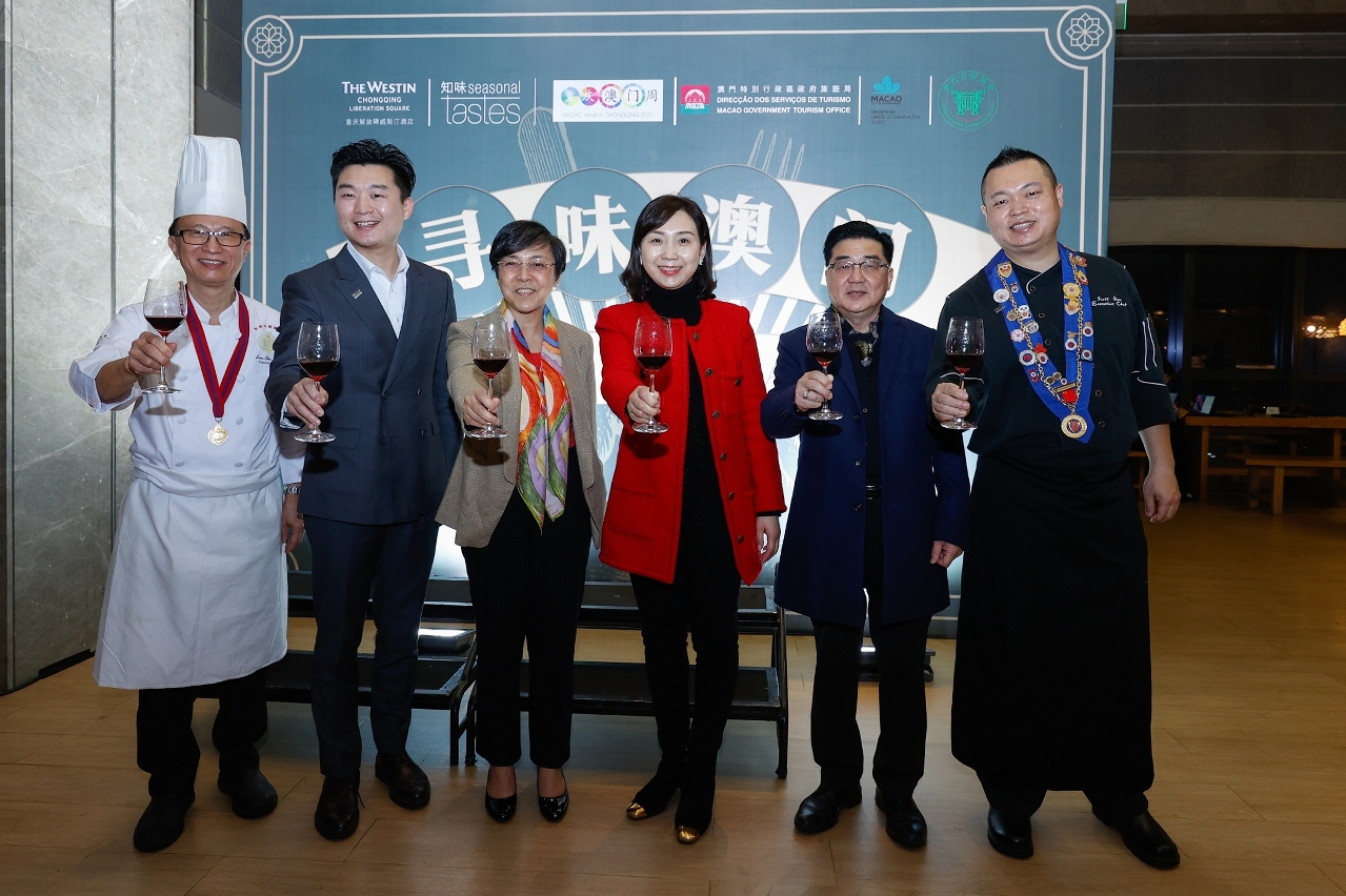 A kick-off ceremony and dinner were held in advance today (2 December) to lift curtains on the “Macao Week in Chongqing – Taste of Macao Food Promotion” jointly organized by Macao Government Tourism Office (MGTO), the Westin Chongqing Liberation Square and Macau Cuisine Association. MGTO Director Maria Helena de Senna Fernandes, Director of Foreign Affairs Office of Yuzhong District People’s Government of Chongqing, Jiang Yonghong, Vice President of Macau Cuisine Association, Iu Iam Lim, Director of Rooms of the Westin Chongqing Liberation Square, Castel Liang, Vice President of Macau Cuisine Association and Leading Chef of the “Taste of Macao Food Promotion”, Lou Chi Seng, and Executive Chef of the Westin Chongqing Liberation Square, Scott Gou, officiated the kick-off ceremony along with other guests.