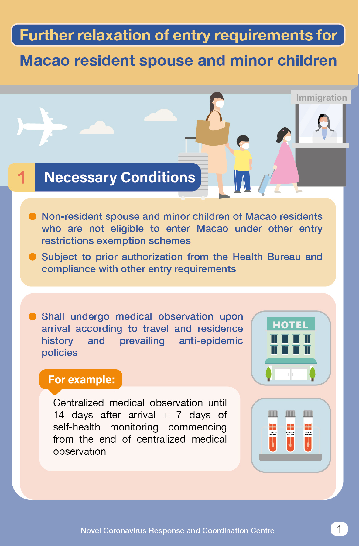 Taking into account the actual needs of local residents and assessing the epidemic risks and changes in relevant countries, the Novel Coronavirus Response and Coordination Centre (hereinafter referred to as the “Centre”) announces, in accordance with the stipulations in clause 3 of Chief Executive Dispatch No. 64/2022, that with effect from 30 May 2022, non-resident spouse and minor children of Macao residents who are unqualified to enter Macao under other entry restrictions exemption schemes may, subject to prior authorization from the health authorities and the prerequisite of fulfilling other entry conditions, enter into the Macao Special Administrative Region.