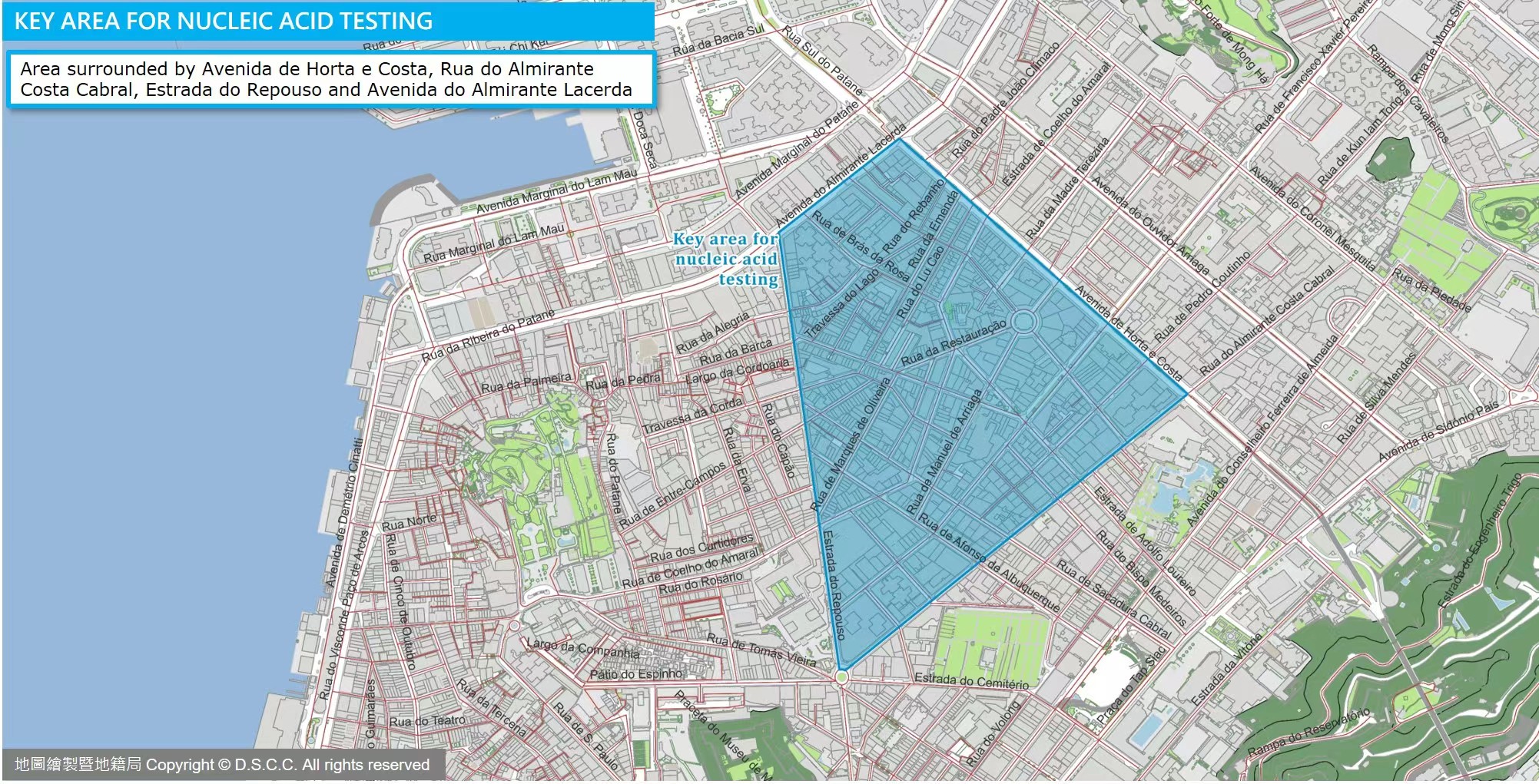 Inspection targets in key areas include: People who live, work or have activities in the area surrounded by Avenida de Horta e Costa, Rua do Almirante Costa Cabral, Estrada Do Repouso, and Avenida do Almirante Lacerda. They must take a NAT at either Pui Ching Middle School, Women’s General Association of Macau Multi-Service Building, Kiang Wu Hospital Auditorium, Macao Federation of Trade Unions Workers Stadium Hall A, 1st Floor or Tap Seac Multisport Pavilion--Pavilion A between 9 a.m. and 9 p.m. on June 22, and the NAT booking link is: https://eservice.ssm.gov.mo/allpeoplernatestbook . Besides, Tap Seac Multisport Pavilion--Pavilion B is also available as a caring station. No booking is required for it.