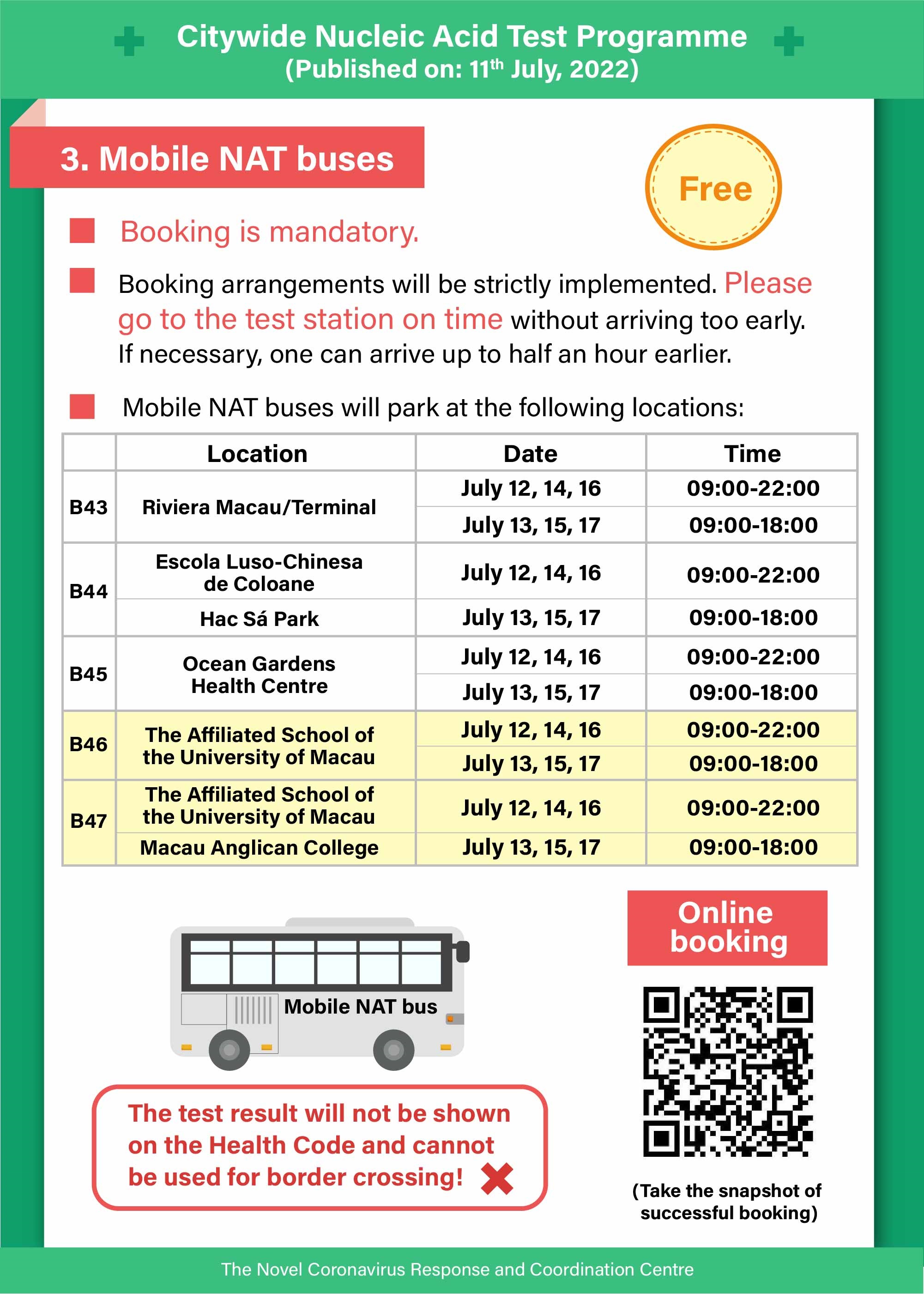 The Novel Coronavirus Response and Coordination Centre states that, to further facilitate NAT sampling for residents in certain areas, taking effect from the 8th round of Citywide NAT (12 to 13 July), two additional mobile NAT buses will be engaged, which will park at the Affiliated School of the University of Maca (Rua de Tai Lin, Lote BT-34, Taipa) and Macau Anglican College (Beco da Baía, Taipa). Residents can make an appointment via the Citywide NAT booking system (https://eservice.ssm.gov.mo/allpeoplernatestbook) from 07:00 tomorrow (12 July). Relevant parking arrangement is as follows: