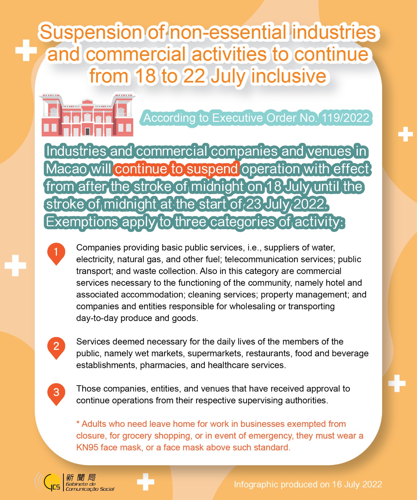 According to Executive Order No. 119/2022, industries and commercial companies and venues in Macao will continue to suspend operation with effect from after the stroke of midnight on 18 July until the stroke of midnight at the start of 23 July 2022.
