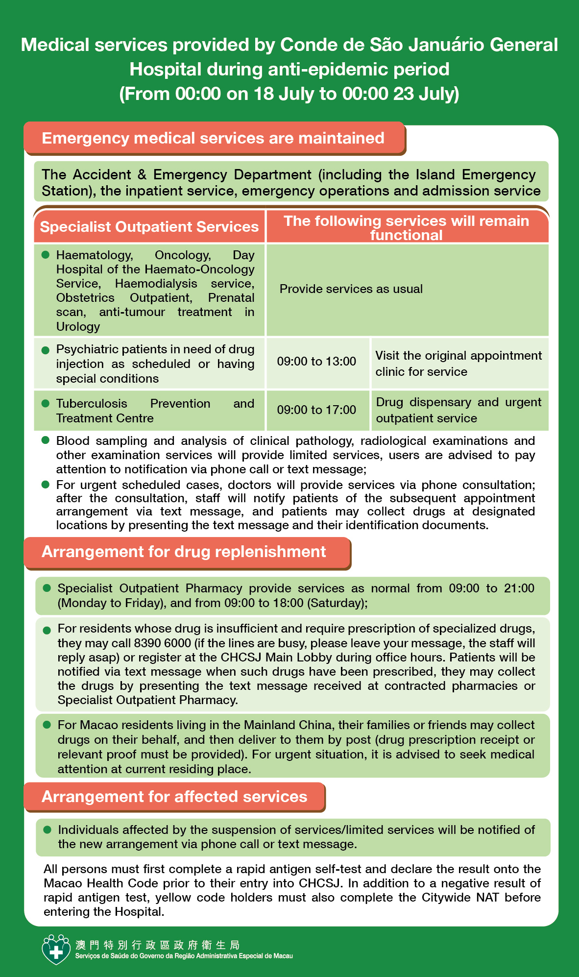 To contain the spread of COVID-19 in the community, all industries and commercial companies and venues in Macao are required to suspend operation from 00:00 on 18 July until 00:00 on 23 July 2022 inclusive. During the anti-epidemic period, health services, drug replenishment and other services of the Conde de São Januário General Hospital, Health Centres and Health Stations are arranged as follows: