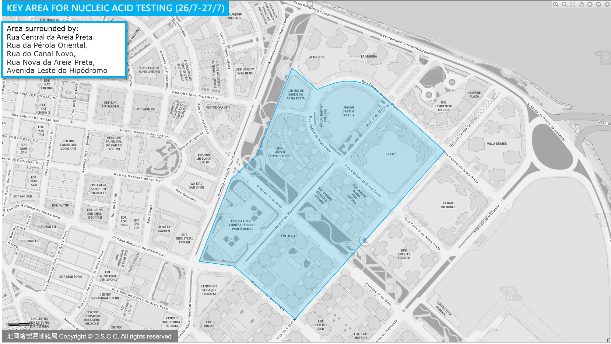 The Novel Coronavirus Response and Coordination Centre announces that, to identify and treat any potential infected persons who may still be lurking in the local community as early as possible, people in the following key areas are subject to a nucleic acid test on either 26 July (Tuesday) or 27 July (Wednesday).