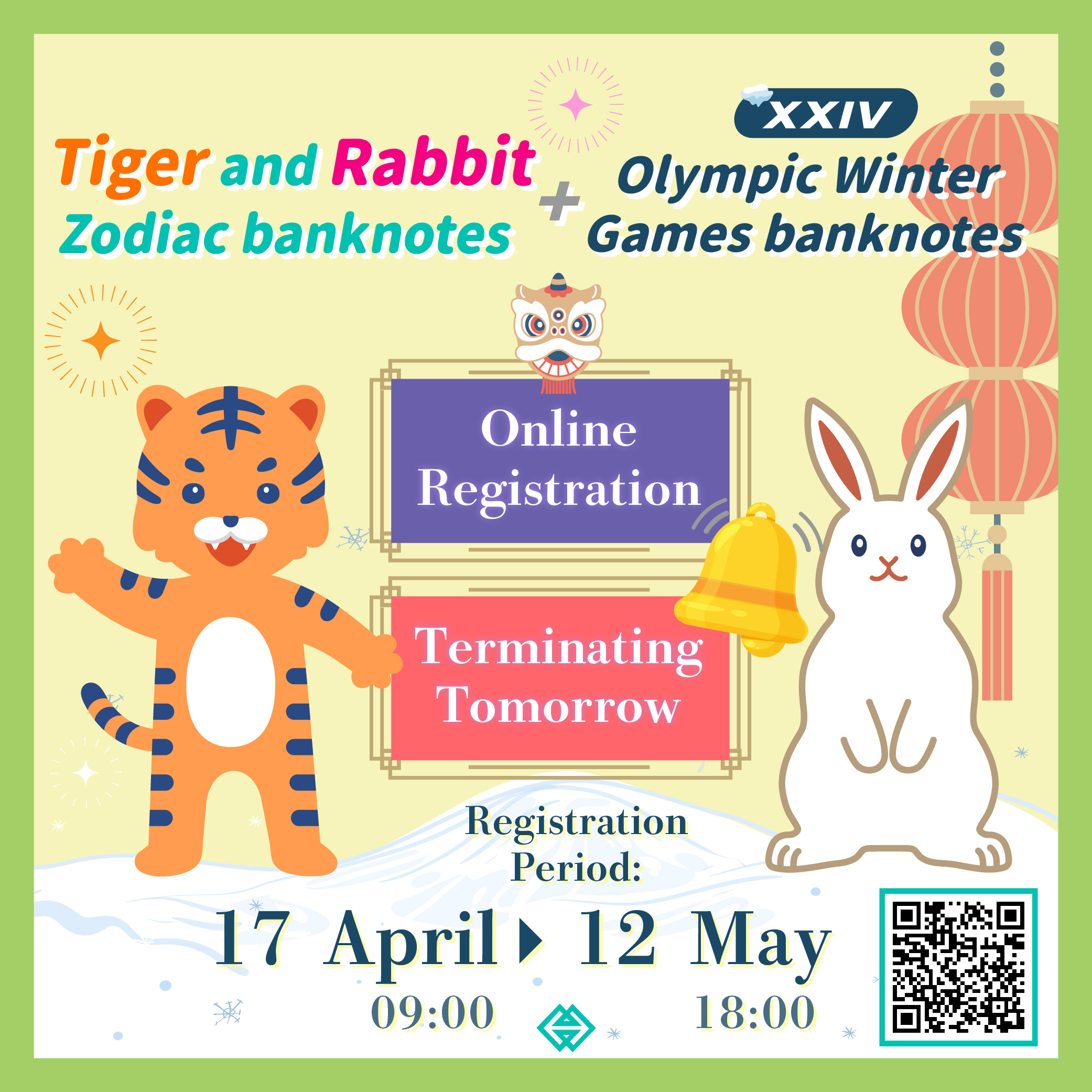 The online registration period for the exchange of the Tiger and Rabbit Zodiac banknotes and the XXIV Olympic Winter Games banknotes will end at 6:00pm tomorrow (May 12). The Monetary Authority of Macao would like to remind those citizens who are interested in exchanging for the said banknotes to complete the registration process before the mentioned deadline.