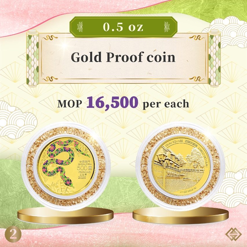 The obverse design of 2025 Year of the Snake commemorative coins features the outline of the Chinese Zodiac sign, portrayed with a vibrant display of the distinctive Portuguese-inspired patterned tiles. The reverse design features the World Heritage Site of Macao, Lilau Square, in a bottom-up perspective presentation, sculpted in the latest angular high relief minting technique. The Year of the Snake commemorative coins comprise a 1 oz and a 5 oz Silver Proof coin as well as a 0.5 oz Gold Proof coin. The selling price of the coins is MOP1,380, MOP8,000 and MOP16,500 respectively.