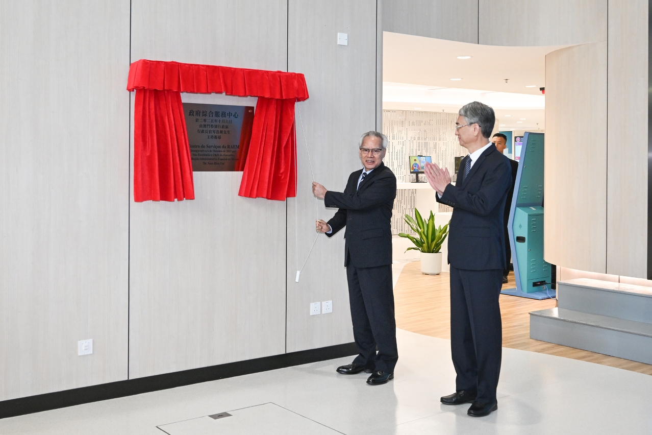 Chief Executive Sam Hou Fai presided over the plaque unveiling ceremony in the company of Cheong Weng Chon, Secretary for Administration and Justice. Moreover, they visited the Services Centre and listened to the introduction from the department leaders and staff on site.