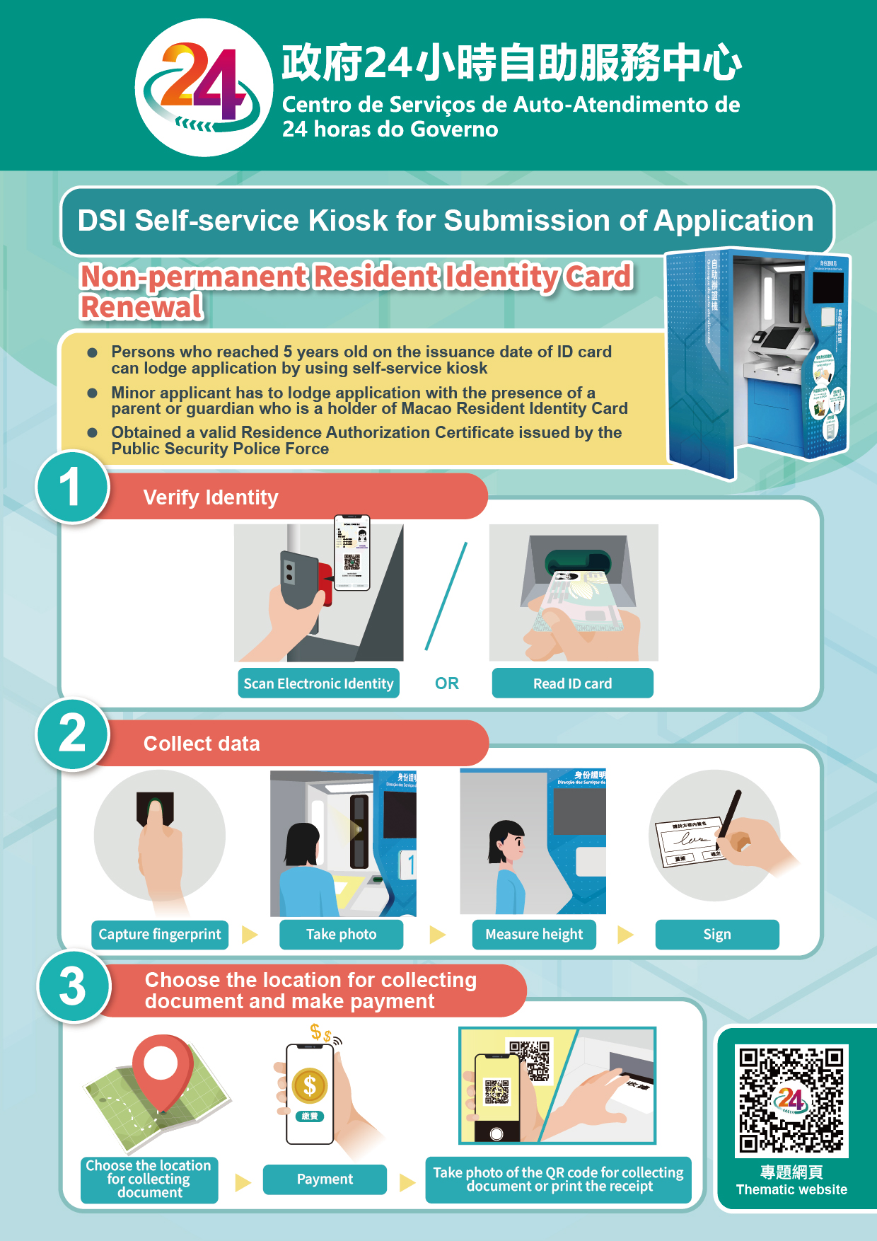 Macao residents aged 5 or above on the latest issuance date of the Macao SAR Non-permanent Resident Identity Card may conduct self-service renewal of their identity card at any Government 24-hour Self-service Centre within the validity period of the Residence Authorization Certificate collected via Macao One Account. It is worth noting that applicants under the age of 18 should be accompanied by a parent or guardian. When renewing their identity card, applicants may choose to use the photo taken on site or submit the “Photo for identification documents” in “My photos” of Macao One Account as their identity card photo and operate according to the system instructions to complete the application procedure.