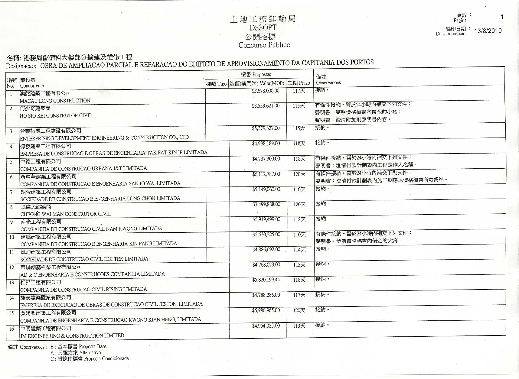 O valor proposto pelas 25 empresas concorrentes variou entre mais de 4 milhões e 600 mil e 8 milhões e 500 mil patacas, dentre os quais 20 foram admitidas e 5 foram admitidas condicionalmente por erros ou omissões nos documentos entregues, pelo que deverão então entregar os documentos em falta dentro do prazo fixado.
