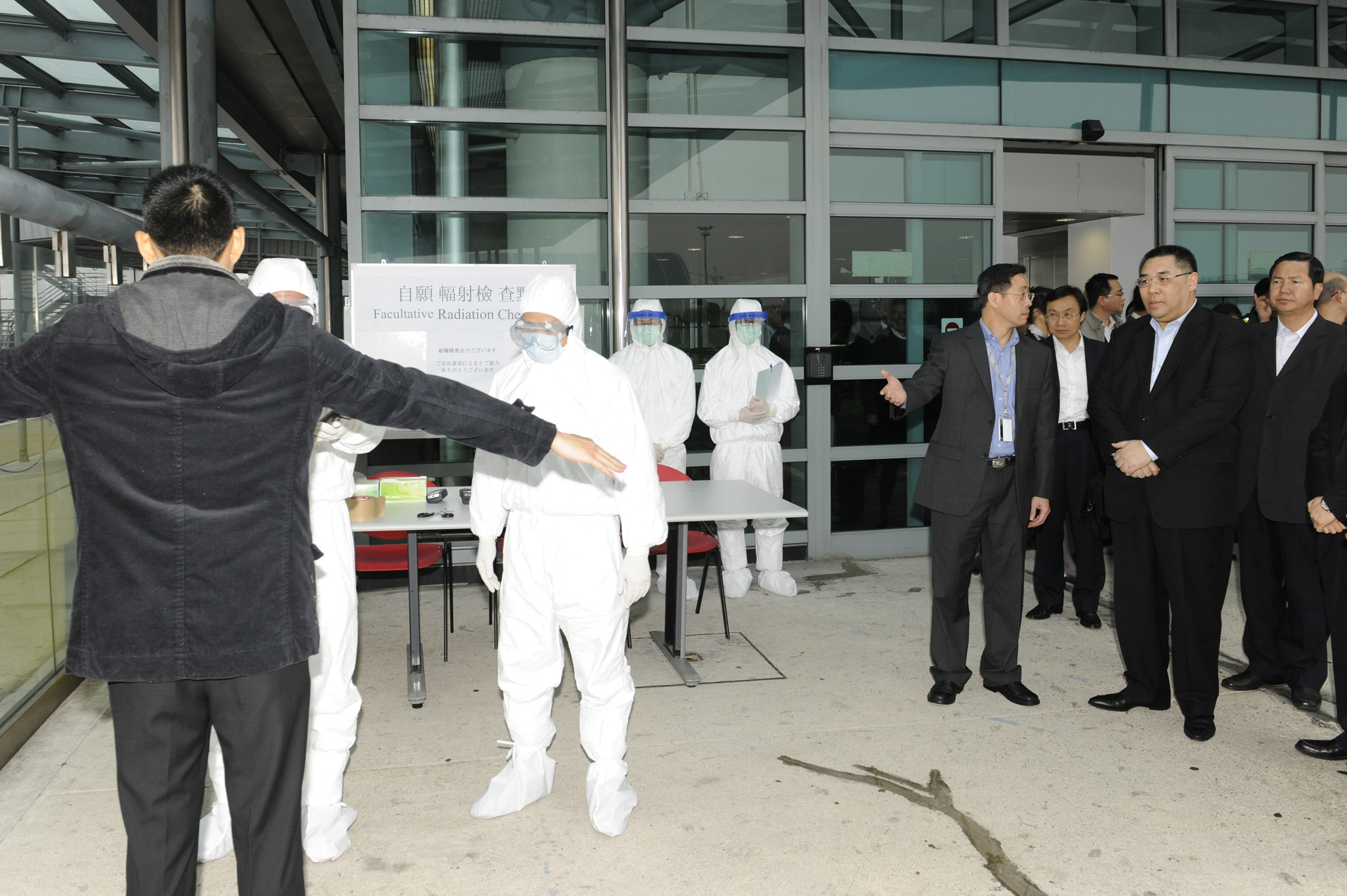 Cheong Kuoc Vá, secretário para a Segurança, Cheong U, secretário para os Assuntos Sociais e Cultura, Alexis Tam, Chefe do Gabinete do Chefe do Executivo, O Lam, secretária-geral do Conselho Executivo e assessora do Gabinete do Chefe do Executivo, Costa Antunes, director dos Serviços de Turismo, Lei Sio Peng, comandante do Corpo da Polícia de Segurança Pública acompanharam Chui Sai On na visita ao posto de controlo de contaminação radioactiva no aeroporto.