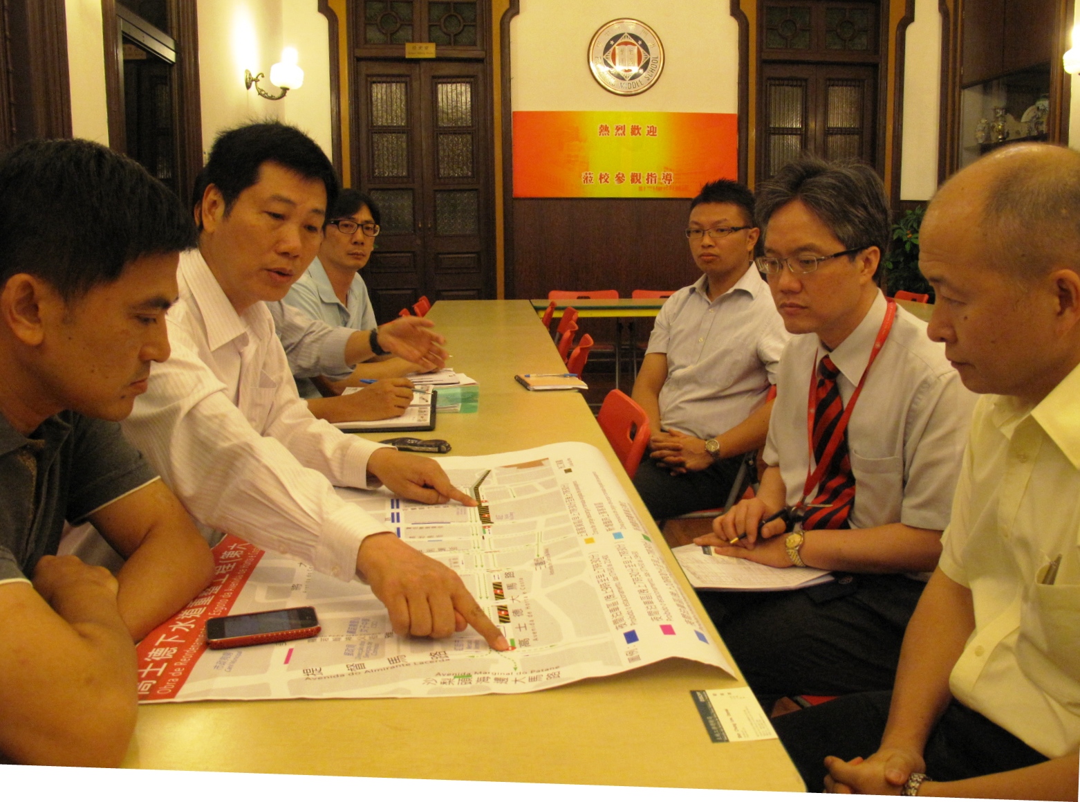 Desde o início de execução da obra de reordenamento do sistema de drenagem da Avenida de Horta e Costa, vieram os serviços competentes visitar várias vezes as associações civis, os comerciantes e as escolas existentes nas imediações, no sentido de ouvir a sua opinião e sugestões sobre a obra, de forma a melhorar o plano de trabalho e os respectivos condicionamentos de trânsito. Atendendo terá em breve início a execução dos trabalhos referentes ao 9.º troço situado em frente da Escola Secundária de Pui Cheng vieram então o Subdirector da DSSOPT, Shin Chung Low Kam Hong, o Chefe, subst.º, da Divisão de Hidráulica e Saneamento, Kuok Chi Cheong e o Chefe da Divisão de Coordenação da DSAT, Mok Soi Tou, visitar novamente a Escola Secundária de Pui Cheng no sentido de lhes explicar o plano de trabalho e os respectivos condicionamentos de trânsito, assim como trocar com estes as opiniões sobre o horário dos trabalhos referentes ao 9.º troço.