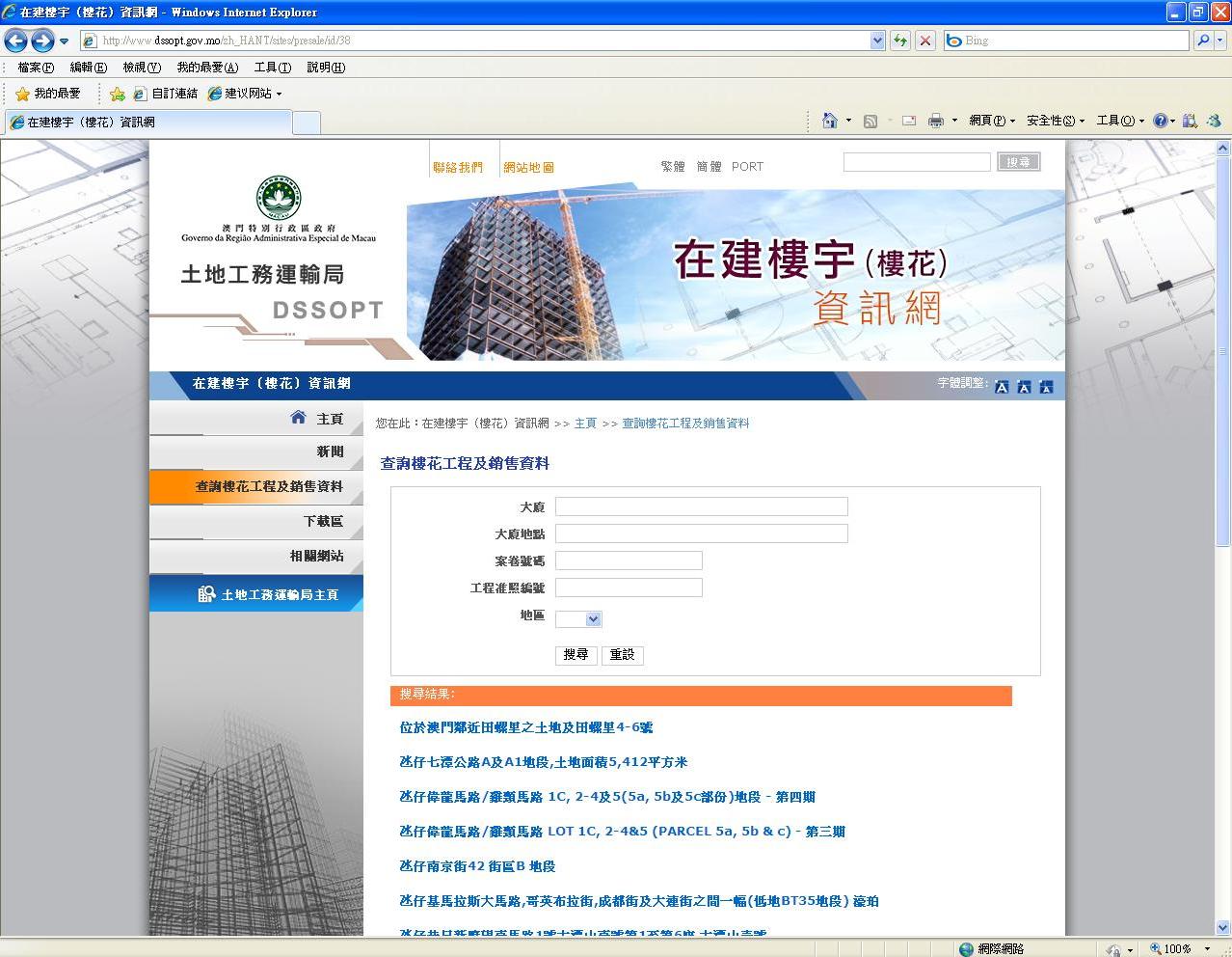 Em harmonia com a entrada em vigor das directivas destinadas a regulamentar a compra e venda de fracções autónomas de edifícios em construção, foi criado pela Administração a Rede de Informações de Fracções Autónomas de Edifícios em Construção. Actualmente se encontram disponíveis neste portal electrónico as informações sobre a situação de obra e de venda das fracções autónomas de mais de 100 edifícios em construção que reúnem já condições para serem vendidas, podendo os cidadãos depois de entrar no portal electrónico da DSSOPT (www.dssopt.gov.mo), ascender em seguida à aludida rede de informações e consultar as informações sobre as fracções autónomas do edifício em construção. A Administração espera poder através da criação deste ciberespaço incrementar a divulgação de informações respeitantes ao mercado imobiliário e auxiliar os cidadãos a tomarem a uma prudente e racional decisão.