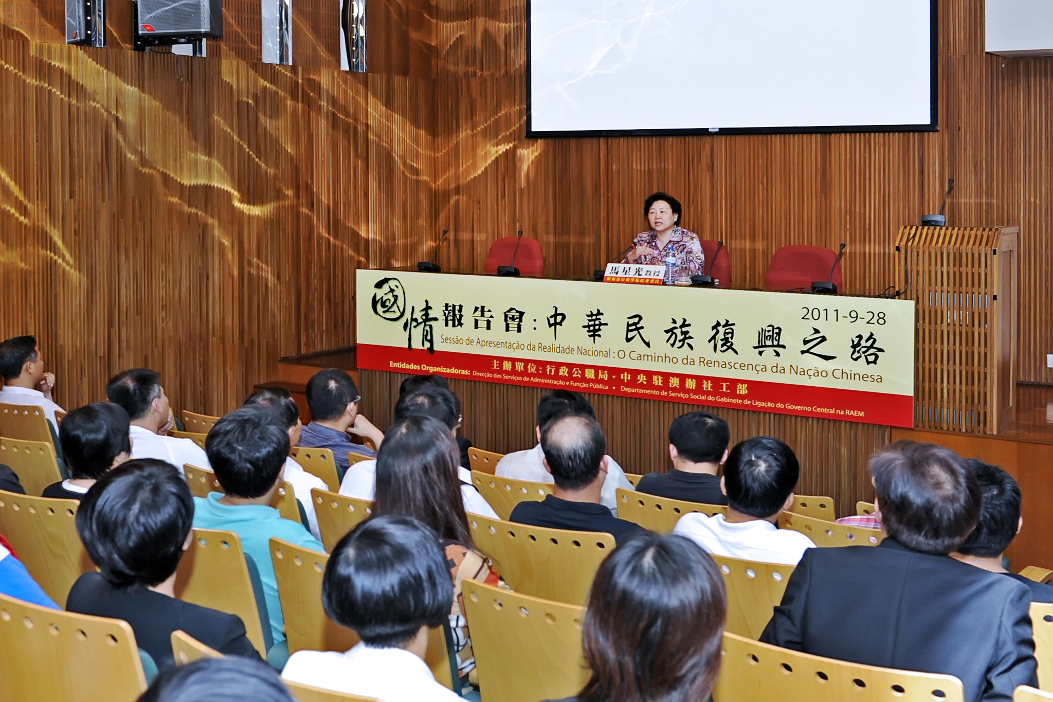 Em comemoração do 62.º aniversário da República Popular da China foi organizada pela Direcção dos Serviços de Administração e Função Pública, em colaboração com o Departamento dos Assuntos Sociais do Gabinete de Ligação do Governo Popular Central na RAEM, no dia 28 de Setembro, à noite, no auditório do Edifício Administração Pública, a Sessão de Apresentação da Realidade Nacional para funcionários da administração pública, que conseguiu reunir mais de 100 responsáveis de 25 associações de trabalhadores da administração pública.