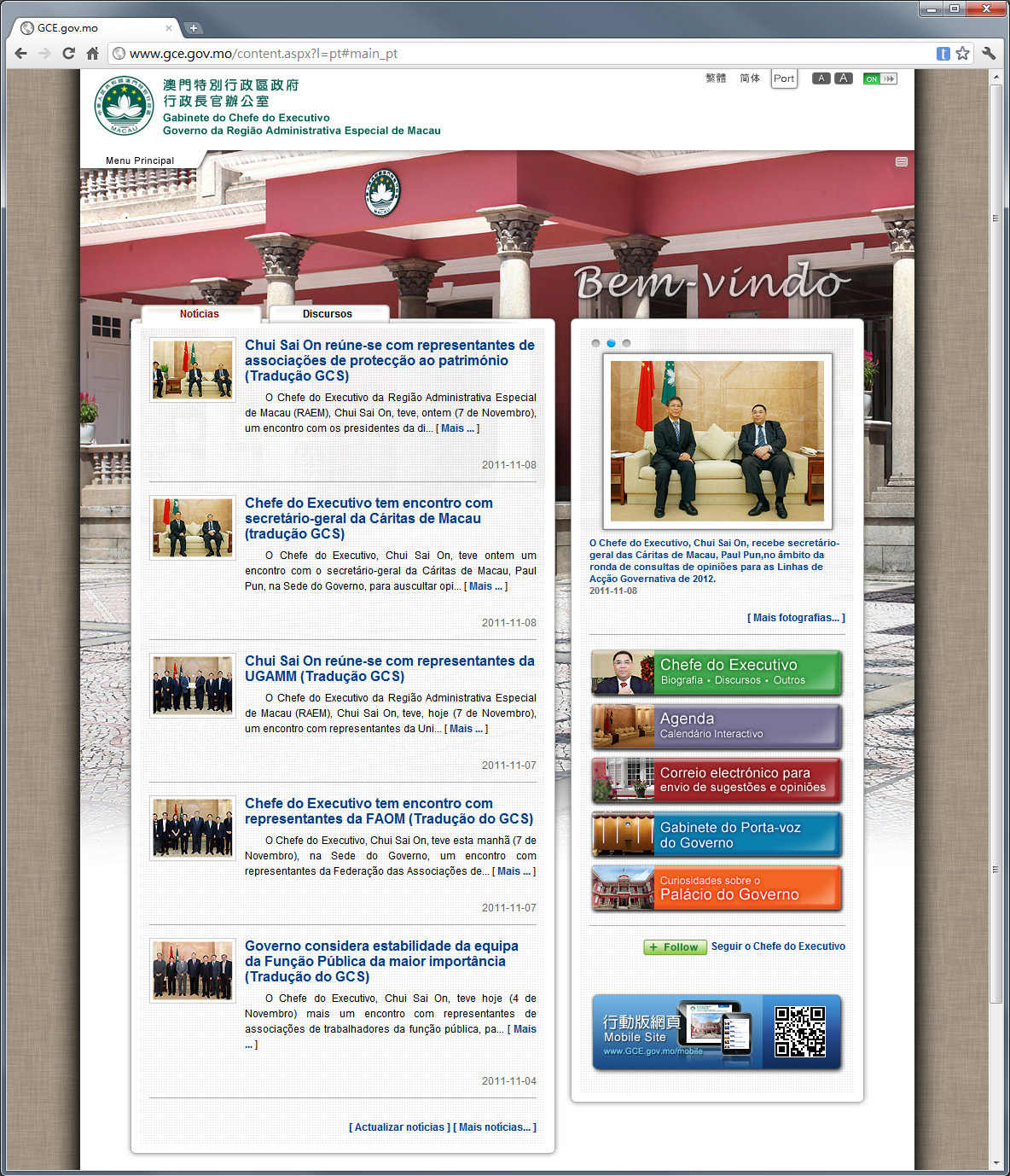 A página electrónica oficial do Gabinete do Chefe do Executivo (www.gce.gov.mo/mobile) está adaptada para ser consultada através de computadores, tablets ou smartphones.