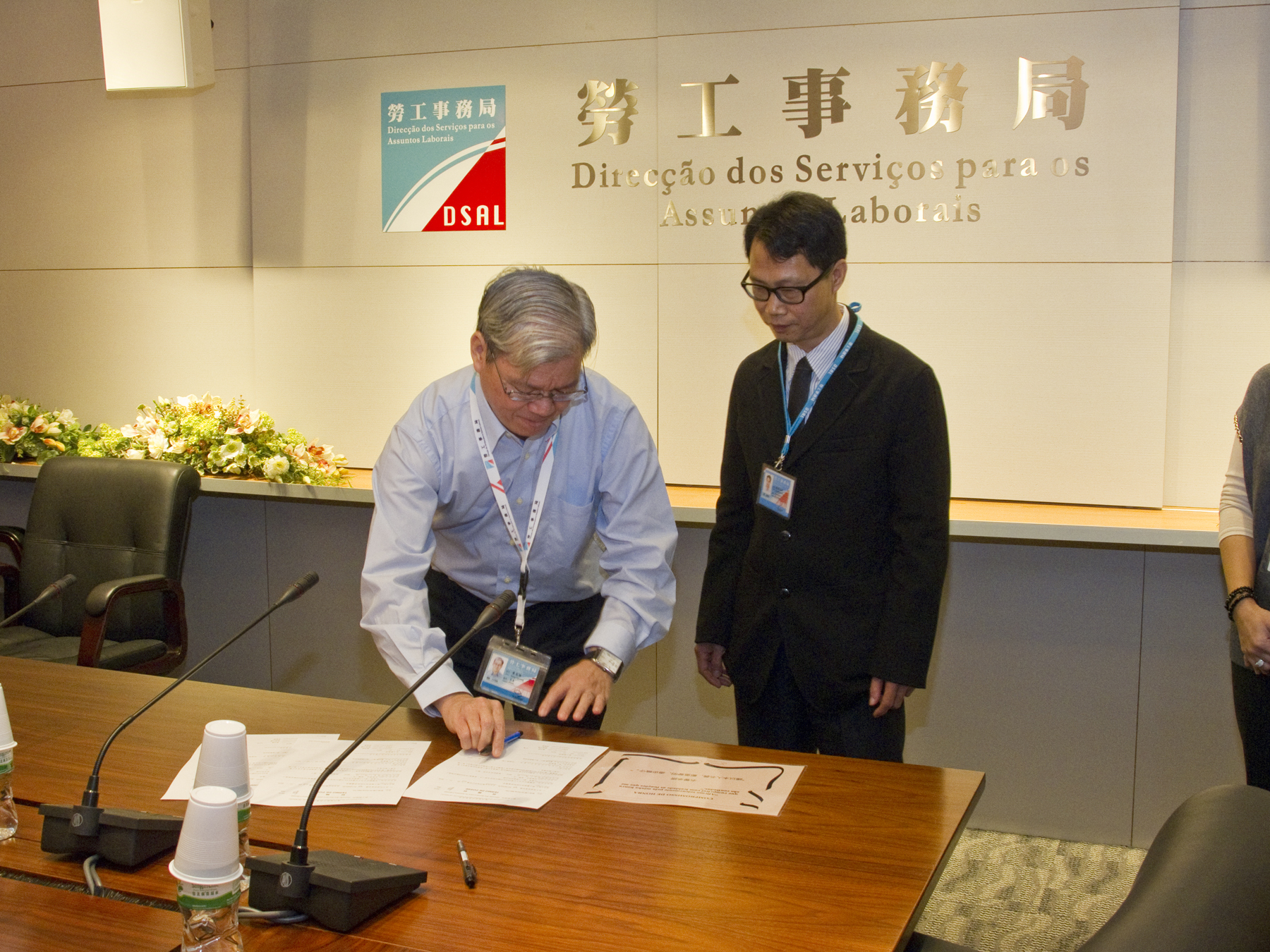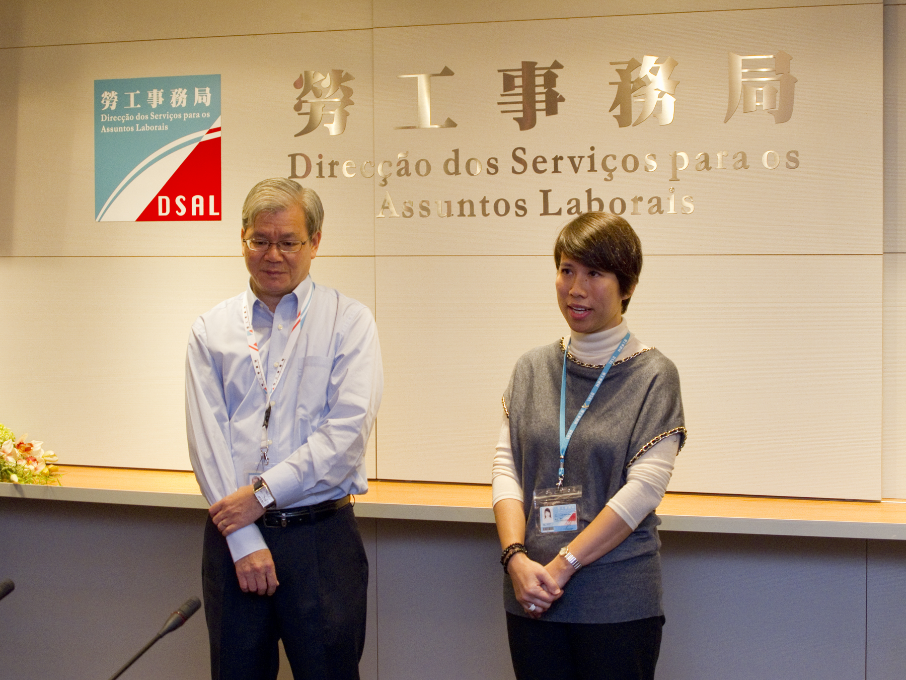 Hoje (dia 23) na sede da Direcção dos Serviços para os Assuntos Laborais (DSAL), sita no Edifício Advance Plaza, realizou-se a cerimónia de tomada de posse da Chefe do Departamento de Inspecção do Trabalho (DIT), Lurdes Maria Sales, e do Chefe da Divisão Administrativa e Financeira (DAF), Ao Ieong Man Pio. A cerimónia foi testemunhada pelo Director da DSAL, Wong Chi Hong, pela subdirectora Teng Nga Kan e pelas diversas chefias dos Departamentos da DSAL.