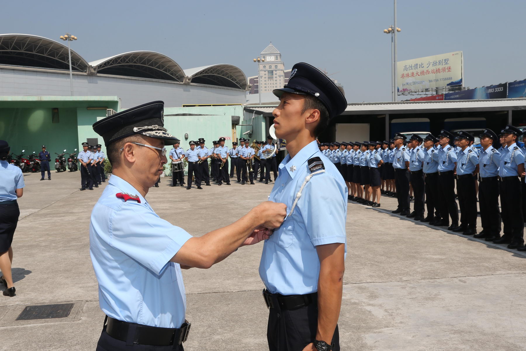 Uma cerimónia de tomada de posse de novos agentes. A cerimónia foi presidida pelo Exmo Sr. Comandante do CPSP, Superintendente Geral Lei Siu Peng, 2ºs Comandantes, Superintendente Lai Kam Kun e Superintendente Mui San Meng, e com a presença de chefias e responsáveis de vários Departamentos desta Corporação, onde foi efectuada a imposição das respectivas divisas aos novos agentes policiais, seguido de juramento como prontos para servir a RAEM.