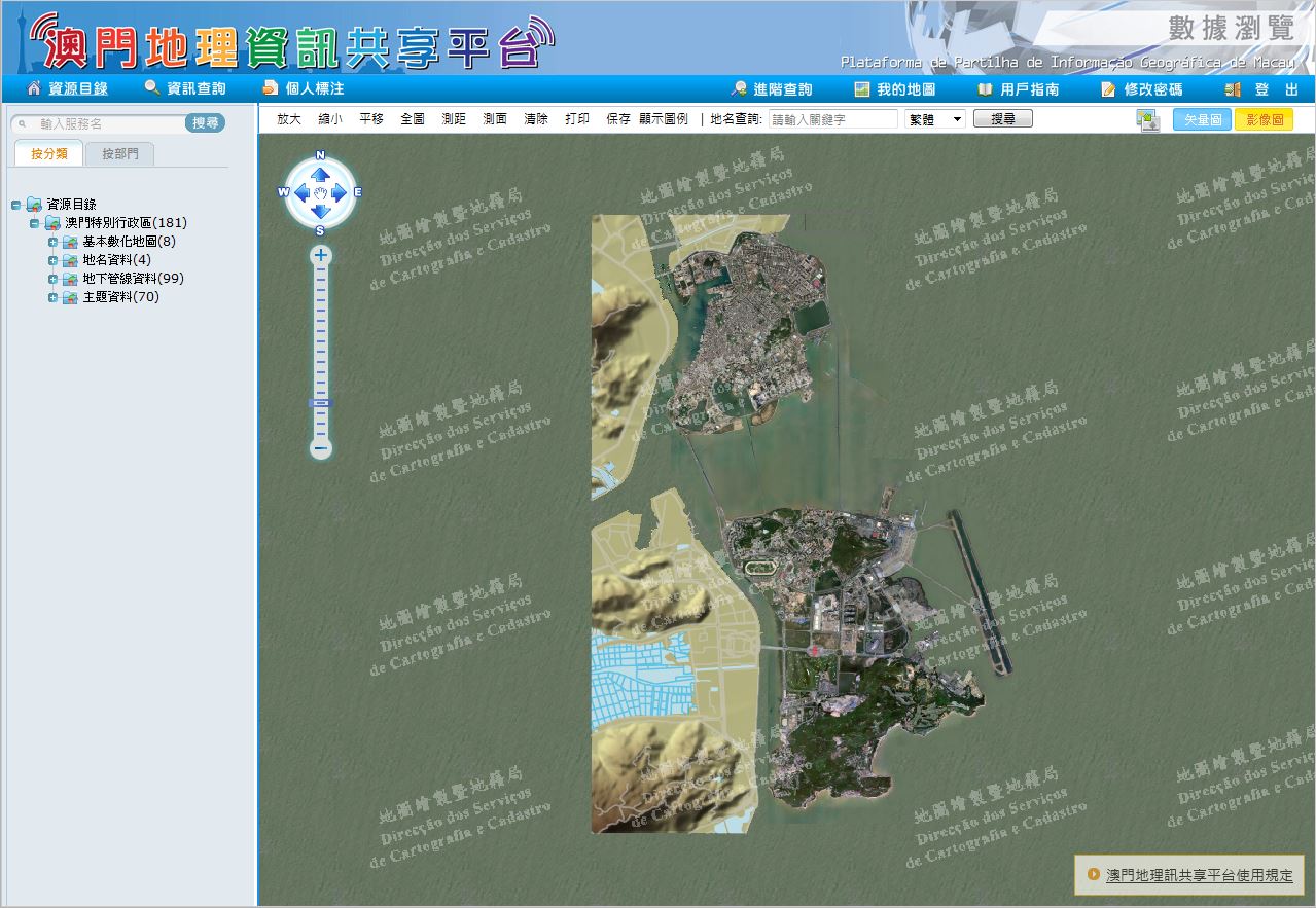O "Plataforma de partilha de informação geográfica de Macau", que está na fase inicial de desenvolvimento, trata-se do acesso aos dados espaciais do Governo e que tem por objectivo estabelecer uma plataforma unificada e um mecanismo de divulgação de recursos espaciais, tendo em vista fortalecer a rede da partilha de informação geográfica entre os departamentos do Governo.