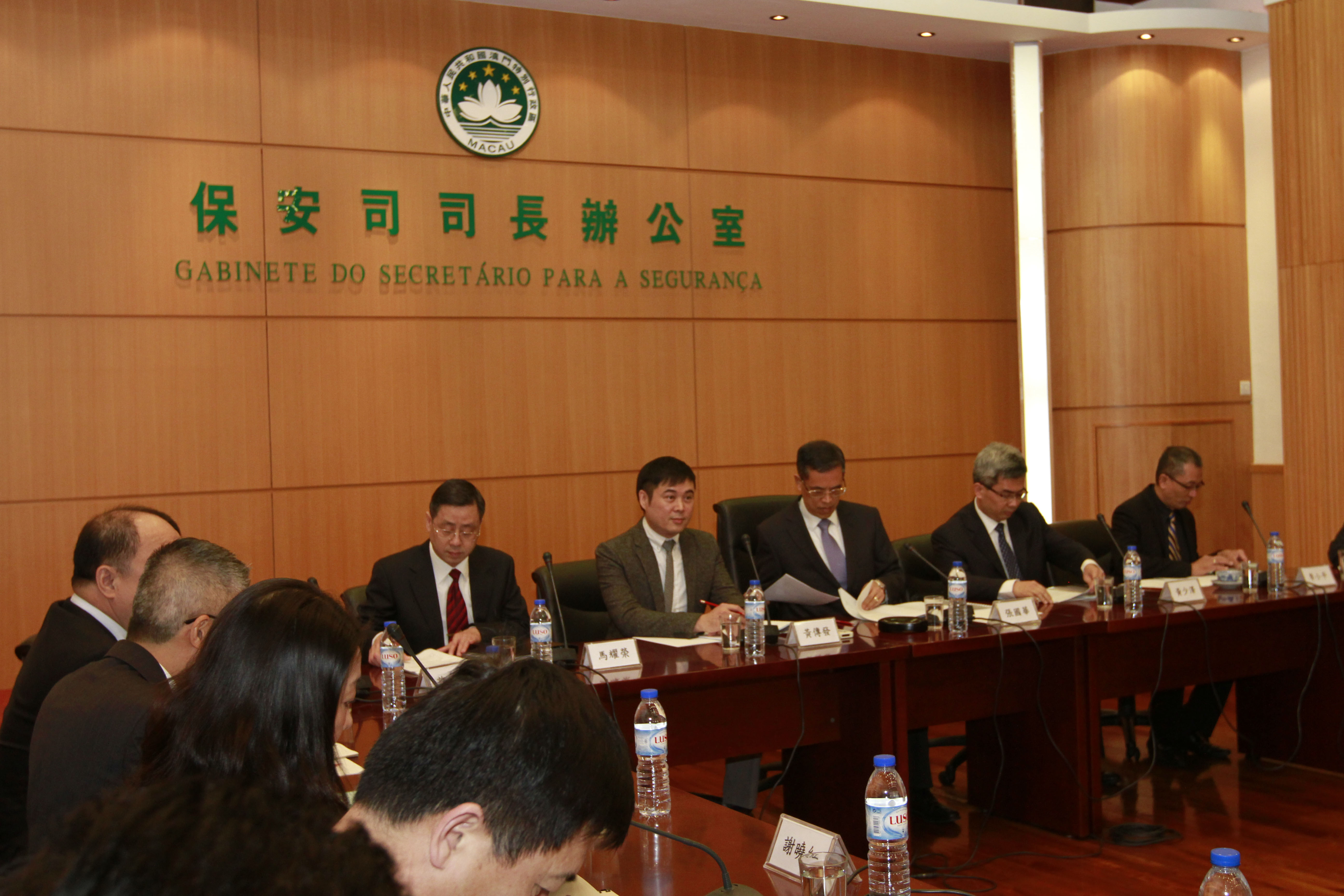 A delegação dos Orgãos de Segurança Pública do Interior chefiada pelo Vice-Ministro de Segurança, Chen Zhi Min foi integrada por responsáveis de diversos serviços, contando-se com a representação do Gabinete para os Assuntos de Hong Kong e de Macau do Conselho do Estado; da estrutura de Formação do Pessoal dos Serviços de Segurança; de Investigação criminal em geral e da investigação dos Crimes Económicos, em particular; da Gestão Fronteiriça; dos Serviços de Investigação de Crimes de Contrabando dos Serviços de Alfândega e dos Serviços de Segurança de Guangdong, Shanghai, ShenZhen, Zhuhai, para além do Serviço de Ligação Policial do Gabinete de Ligação do Governo Popular Central na RAEM. A delegação chefiada pelo Secretário para a Segurança do Governo da RAEM, Cheong Kuoc Vá, integrou o seu Chefe do Gabinete, Vong Chun Fat, e, o Director da Polícia Judiciária, Wong Sio Chak, o Comandante do Corpo de Bombeiros, Ma Io Weng, o Comandante do Corpo de Polícia de Segurança Pública, Lei Sio Peng, o Director da Escola Superior das Forças de Segurança de Macau, Hoi Sio Iong, o Director da Direcção dos Serviços das Forças de Segurança de Macau, Pun Su Peng, o Coordenador do Gabinete Coordenador de Segurança, Cheang Seng Chio, o Adjunto do Comandante-Geral dos Serviços de Polícia Unitários, Ma Io Kun, o Adjunto do Director-Geral dos Serviços de Alfândega, Sin Wun Kao e ainda, os Assessores do Gabinete do Secretário para a Segurança.