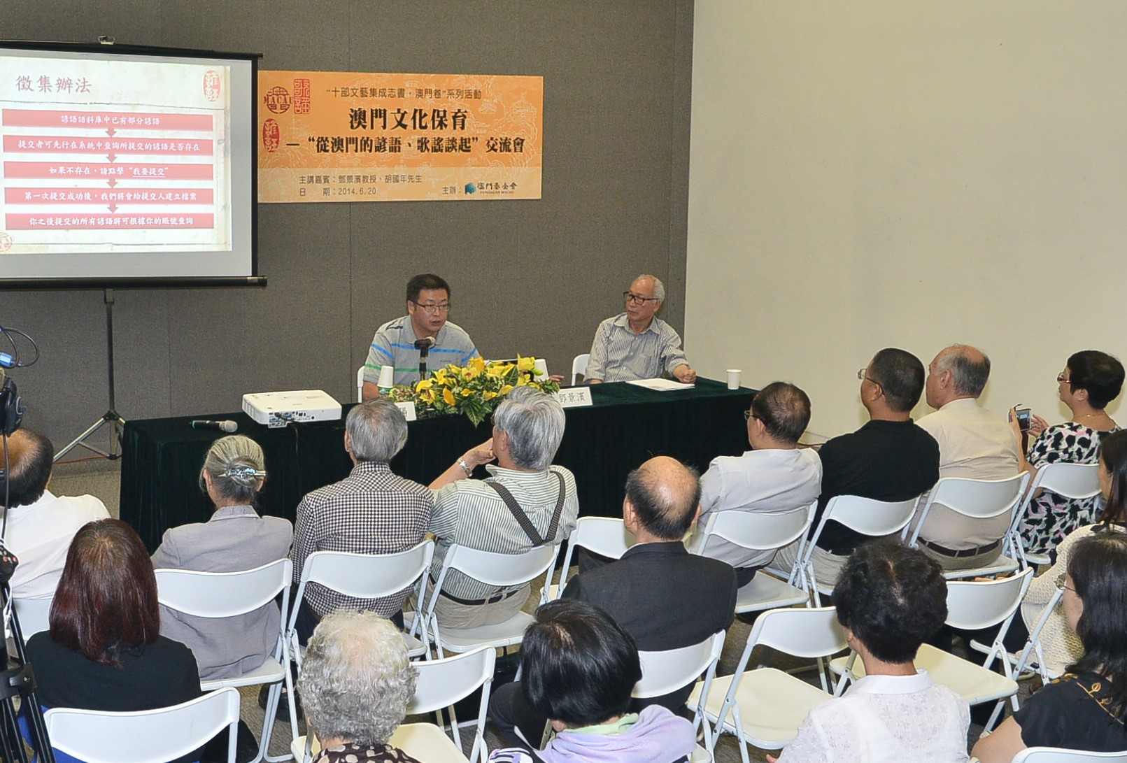 O Seminário “Protecção da Cultura de Macau – Provérbios, Frases Idiomáticas e Canções”, organizado pela Fundação Macau, teve lugar no passado dia 20 de Junho de 2014 no Centro UNESCO de Macau e foi presidido pelos responsáveis das equipas encarregadas da edição da “Colectânea de Provérbios e Frases Idiomáticas Chineses – Tomo de Macau” e “Colectânea de Canções Chinesas – Tomo de Macau”, respectivamente, Prof. Tang Keng Pan e Dr. Wu Kuok Nin. Estiveram também presentes no seminário o Presidente do Conselho de Administração da Fundação Macau, Wu Zhiliang, as diversas equipas encarregadas da edição da “Colectânea das Crónicas das 10 Artes e Cultura Chinesa – Tomo de Macau” e mais de 60 personalidades oriundas de diversos sectores sociais de Macau, incluindo os sectores cultural, educativo e artístico e, ainda, do sector dos jogos de fortuna e azar. No seminário, houve uma troca de opiniões muito calorosa, entre os oradores e participantes, sobre a arte e cultura popular de Macau e as respectivas formas de preservação.