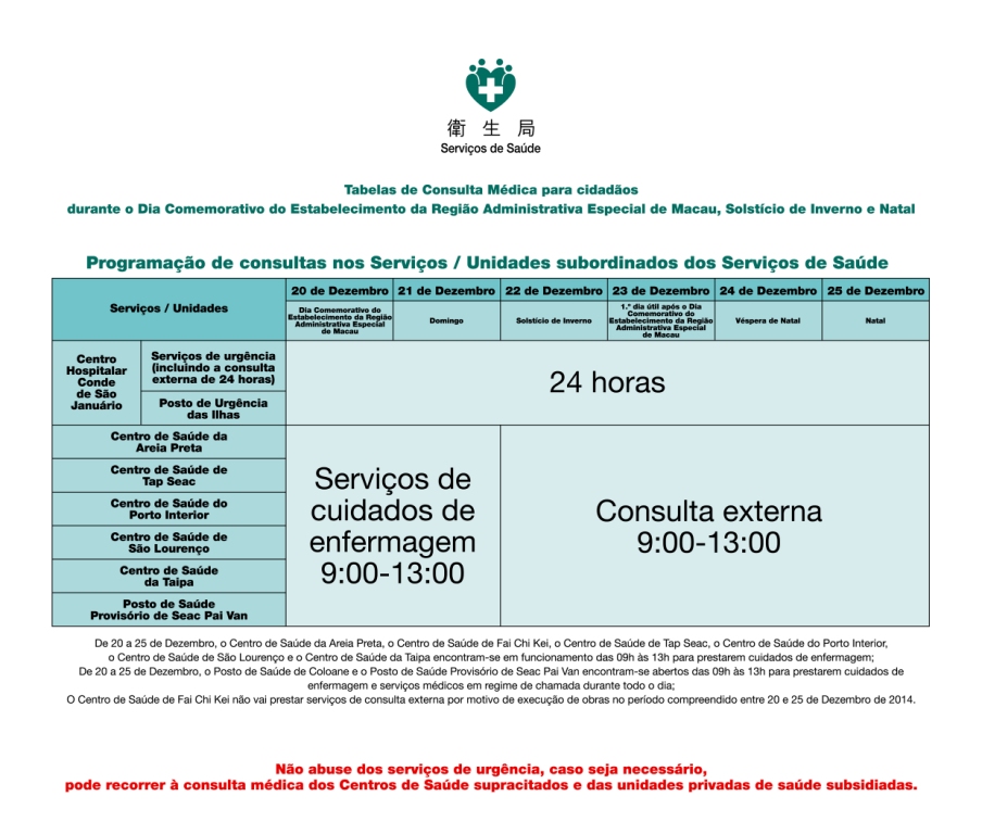 Relativamente aos Centros de Saúde, e em face da situação de utilização dos serviços de consultas não marcadas dos Centros de Saúde por parte dos cidadãos, são estabelecidos os serviços de consultas externas não marcadas nos Centros de Saúde da Areia Preta, de Tap Seac, do Porto Interior, de São Lourenço, da Taipa e Posto Provisório de Saúde Seac Pai Van em Coloane, no período compreendido entre 22 e 25 de Dezembro de 2014, das 09h00 às 13h00. O Centro de Saúde de Fai Chi Kei por motivo de execução de obras, não vai prestar serviços de consultas externas não marcadas. A par disso, os Centros de Saúde da Areia Preta, de Fai Chi Kei, de Tap Seac, de Porto Interior, de São Lourenço e da Taipa proporcionam cuidados de enfermagem no período compreendido entre 20 e 25 de Dezembro de 2014, das 09h00 às 13h00. O Posto de Saúde de Coloane e o Posto Provisório de Seac Pai Van em Coloane prestam cuidados de enfermagem das 09h00 às 13h00 e serviços médicos em regime de chamada durante 24 horas, no período compreendido entre 20 e 25 de Dezembro de 2014.